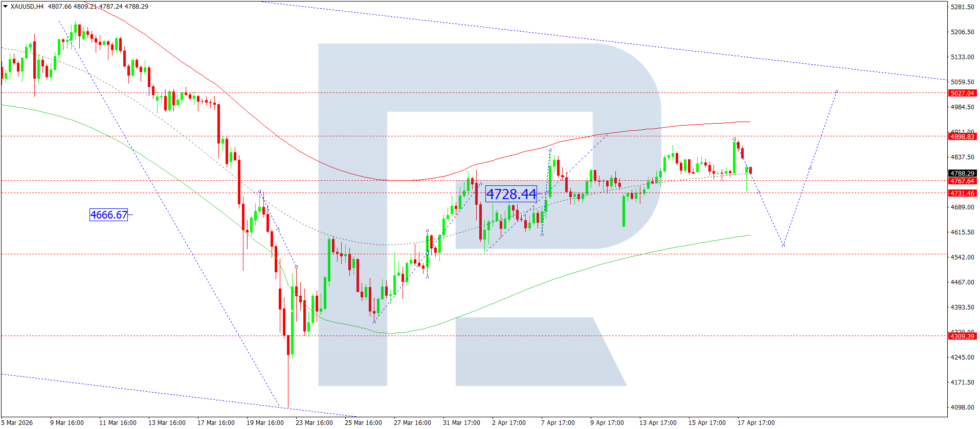 บนกราฟ H4 ของ XAUUSD ตลาดกำลังก่อตัวช่วงการสะสมตัวรอบระดับ 4,800 วันนี้ 20 เมษายน 2026 คาดว่าราคาจะปรับตัวลงไปที่ 4,545 ก่อนจะปรับตัวขึ้นไปที่ 4,737