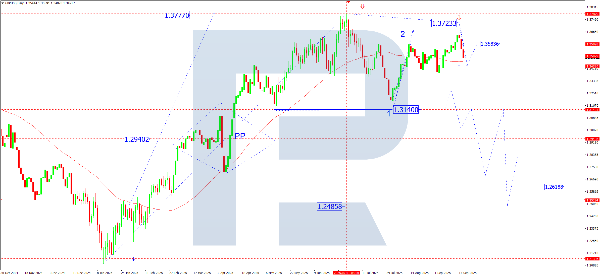 การร่วงแบบห้าคลื่นยังคงดำเนินอยู่: คาดว่าคลื่นที่สามจะพัฒนา โดยมีเป้าหมายที่ 1.3140 ซึ่งเป็นเพียงครึ่งทางของคลื่น