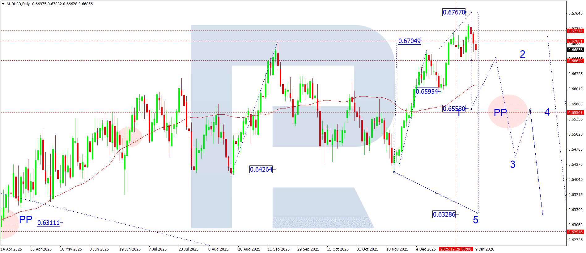บนกราฟรายวัน AUDUSD ตลาดทำอิมพัลส์ขาลงเสร็จสิ้น โดยแตะขอบล่างของกรอบสะสม โครงสร้างปัจจุบันบ่งชี้การต่อเนื่องของเทรนด์ขาลง