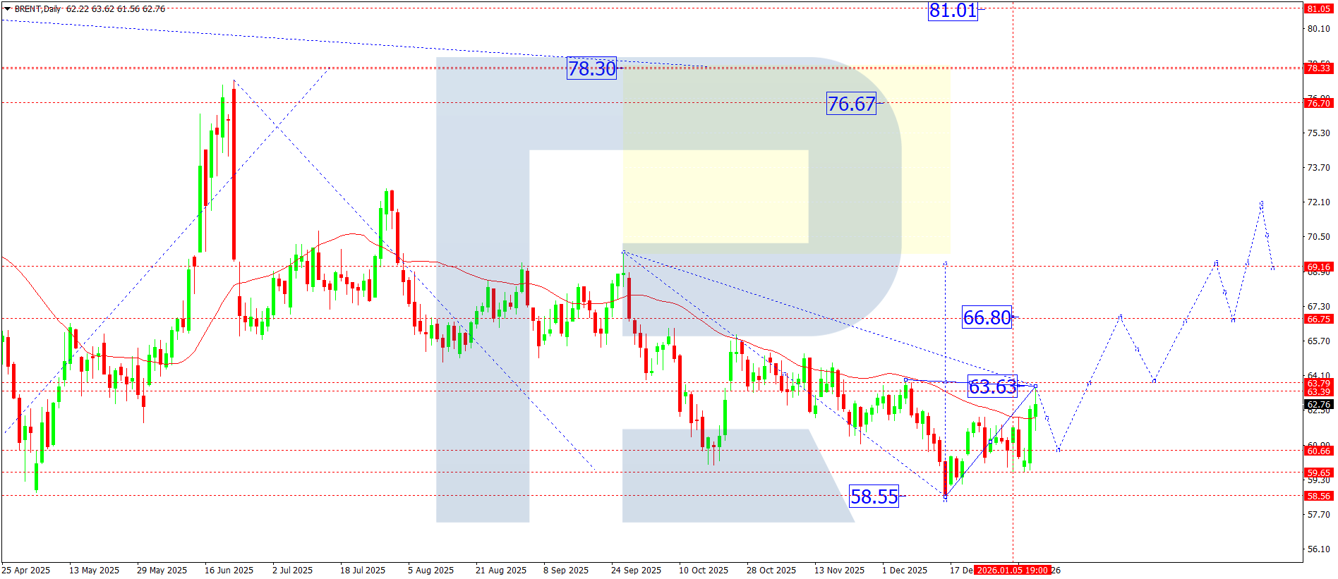 บนกราฟรายวัน Brent ทำโครงสร้างคลื่นขึ้นเสร็จสิ้นโดยแตะ 63.62 สัปดาห์นี้คาดว่าจะก่อกรอบสะสมใต้ระดับนี้