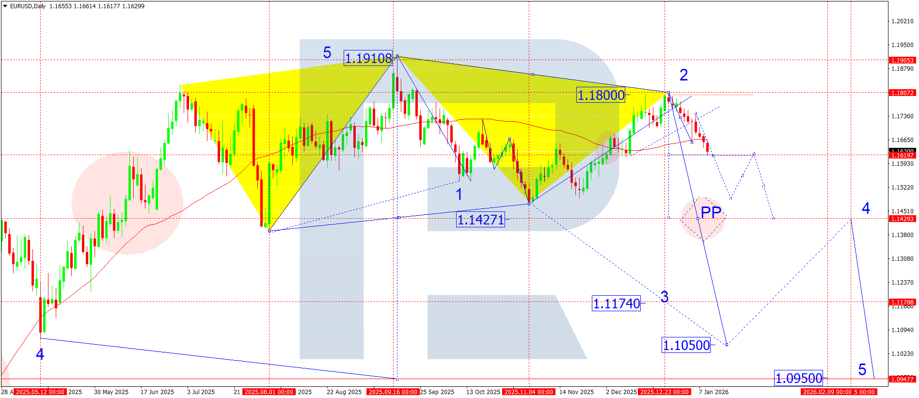 บนกราฟรายวัน EURUSD ช่วงต้นปี ตลาดสร้างอิมพัลส์ขาลงสู่ 1.1660 ตามด้วยคลื่นแก้ไขที่ทำจุดสูงใกล้ 1.1744 และแทบจะก่อกรอบสะสมรอบ 1.1744 แล้ว