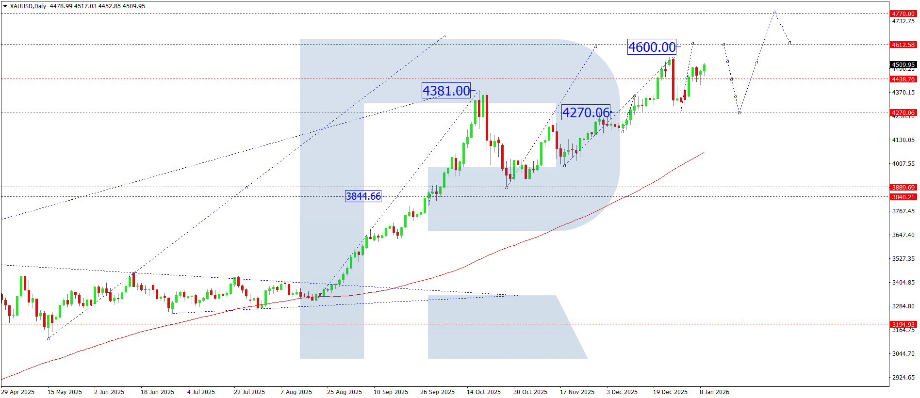 บนกราฟรายวันทองคำ ตลาดเบรกเหนือ 4,499 และคงโมเมนตัมขาขึ้น โดยมีเป้าหมายปัจจุบันในโซน 4,600 สัปดาห์นี้คาดว่าตลาดจะไปถึงระดับดังกล่าวก่อนจะเกิดการแก้ไขและกลับมาที่ 4,499 (ทดสอบจากด้านบน)