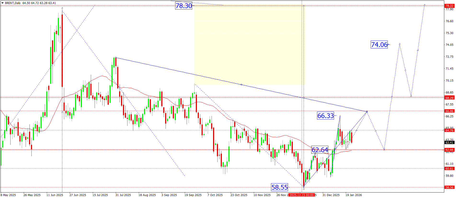 บนกราฟรายวัน น้ำมันดิบ Brent กำลังก่อตัวโครงสร้างคลื่นขาขึ้น โดยมีเป้าหมายระยะใกล้แถว 66.75 หลังจากจบอิมพัลส์แล้ว ตลาดได้ย่อแก้ไขลงมาที่ระดับ 63.00 ซึ่งเป็นจุดที่เริ่มมีแรงซื้อกลับเข้ามา