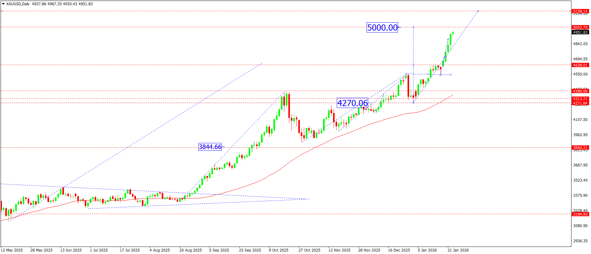บนกราฟรายวัน XAUUSD ตลาดเบรกเหนือระดับสำคัญที่ 4,888 อย่างมั่นคง ซึ่งก่อนหน้านี้ทำหน้าที่เป็นโซนซัพพลาย หลังการเบรก ราคาได้แรงรับยืนยันจากด้านบนและต่อยอดคลื่นขาขึ้นแบบอิมพัลส์ โครงสร้างปัจจุบันชี้ไปที่การขึ้นต่อสู่ระดับจิตวิทยา 5,000 ซึ่งเป็นเป้าหมายหลักของสัปดาห์นี้