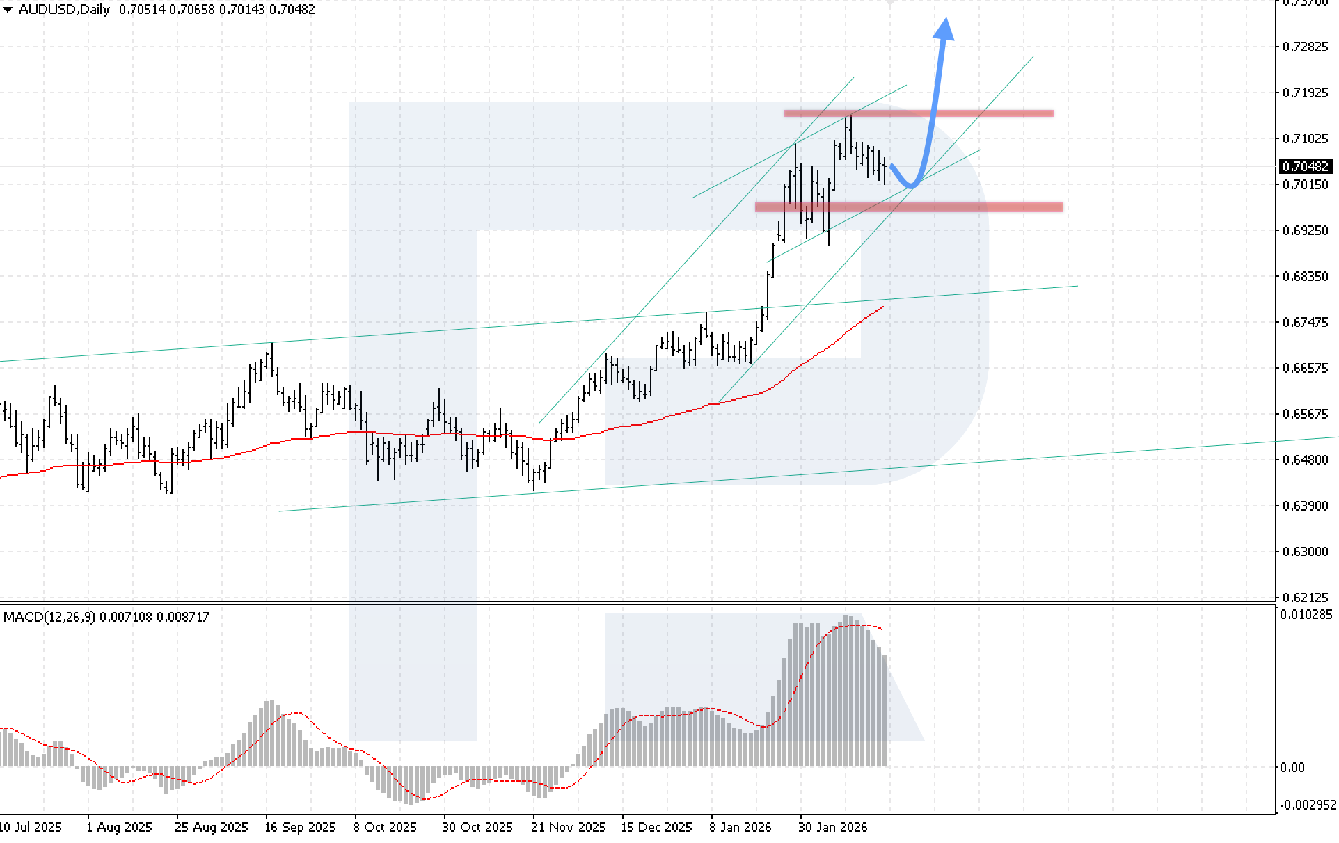 MACD ยืนยันช่วงปรับฐาน ฮิสโตแกรมลดลงหลังทำจุดสูงสุดระยะสั้น สะท้อนโมเมนตัมที่ชะลอ และเส้นสัญญาณเคลื่อนออกจากโซนฮิสโตแกรม ระหว่างการปรับขึ้นถัดไป ผู้ซื้ออาจต้องฝ่าด่าน bearish divergence เงื่อนไขสำคัญของฉากขาขึ้นคือราคาต้องยืนเหนือ 0.7145 การทะลุระดับนี้จะยืนยันความพร้อมของตลาดในการไปต่อ