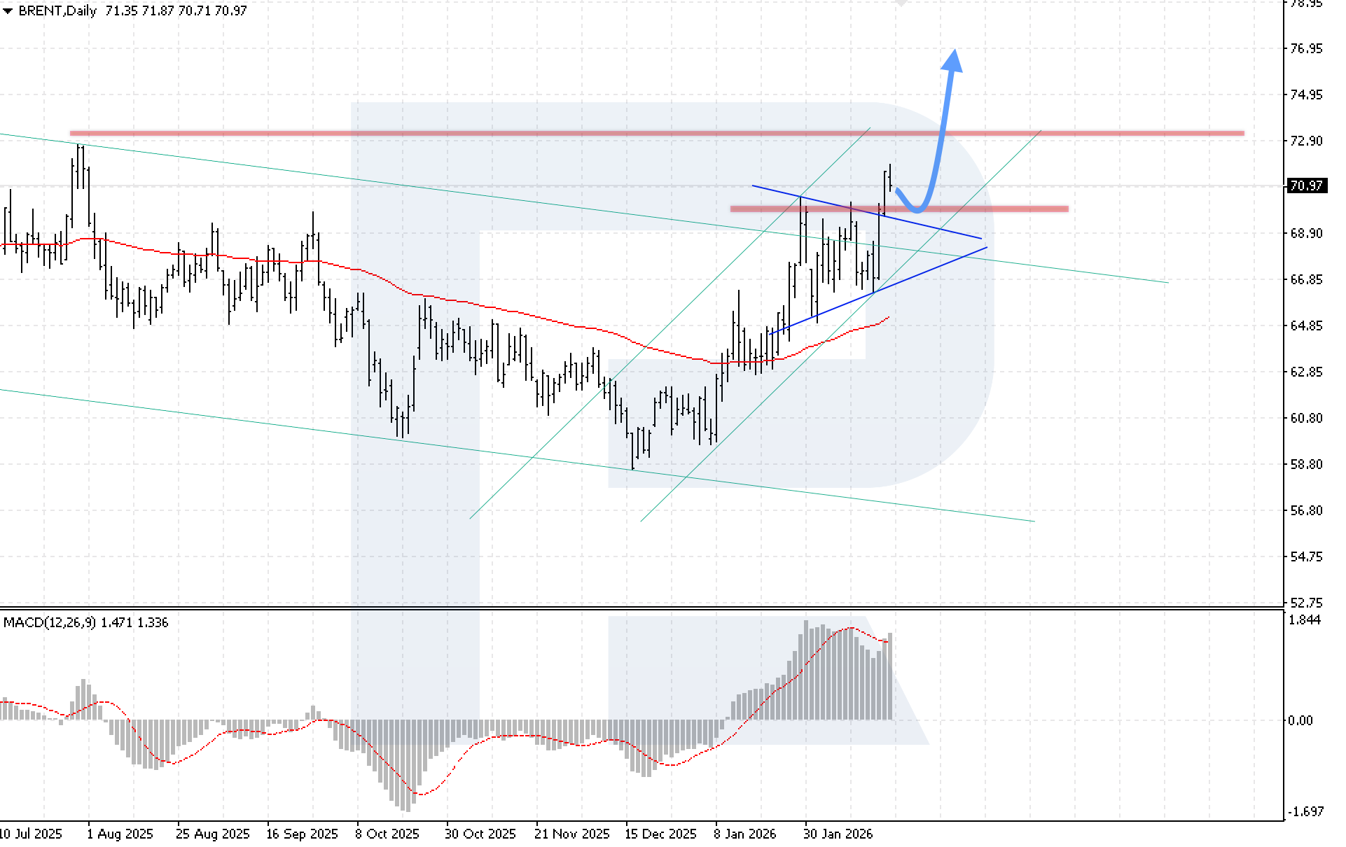 MACD ยืนยันช่วงขาขึ้น ฮิสโตแกรมเพิ่มขึ้นต่อเนื่อง แม้ผู้ซื้ออาจเผชิญการก่อตัวของ bearish divergence เงื่อนไขสำคัญของฉากขาขึ้นสัปดาห์นี้คือราคาต้องยืนเหนือ 72.90 USD