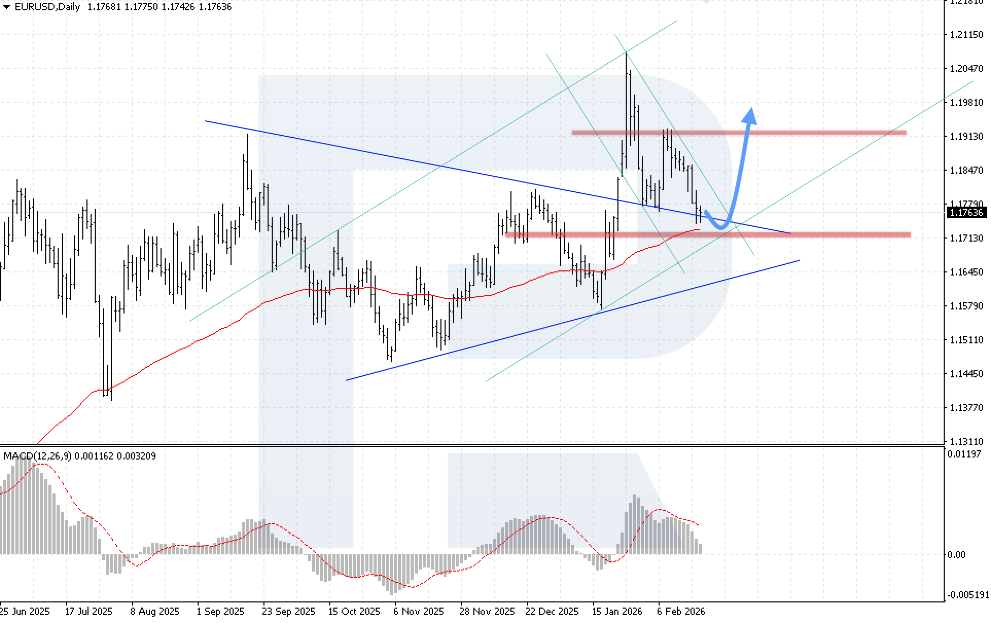 MACD ชี้ถึงช่วงสะสมกำลัง (consolidation) โดยฮิสโตแกรมยังลดลง สะท้อนโมเมนตัมที่ชะลอ และเกือบแตะเส้นศูนย์ บ่งชี้สมดุลอำนาจระหว่างผู้ซื้อ-ผู้ขาย เงื่อนไขสำคัญของฉากขาขึ้นสัปดาห์นี้คือราคาต้องยืนเหนือ 1.1825 ซึ่งจะยืนยันการทะลุขอบบนของช่องปรับฐานขาลง และเปิดทางให้ฟื้นตัวต่อ
