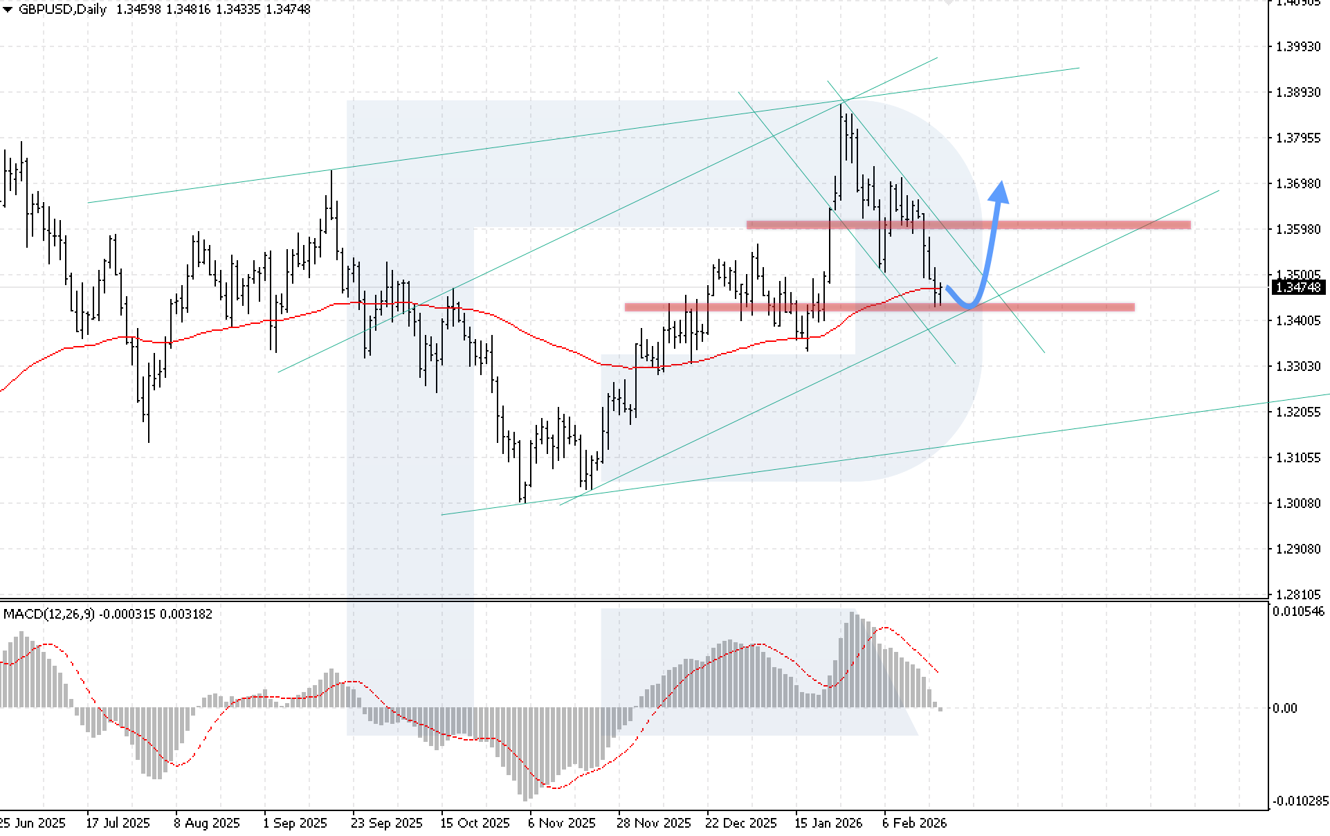 MACD สะท้อนช่วงปรับฐาน ฮิสโตแกรมลดลงและตัดลงต่ำกว่าเส้นศูนย์ บ่งชี้โมเมนตัมที่ชะลอ เงื่อนไขสำคัญของฉากขาขึ้นคือราคาต้องยืนเหนือแนวต้านเฉพาะหน้าที่ 1.3545 ซึ่งจะยืนยันการฟื้นตัวด้วยการทะลุผ่านช่องปรับฐานขาลง และเพิ่มโอกาสไปยังเป้าหมาย 1.3925