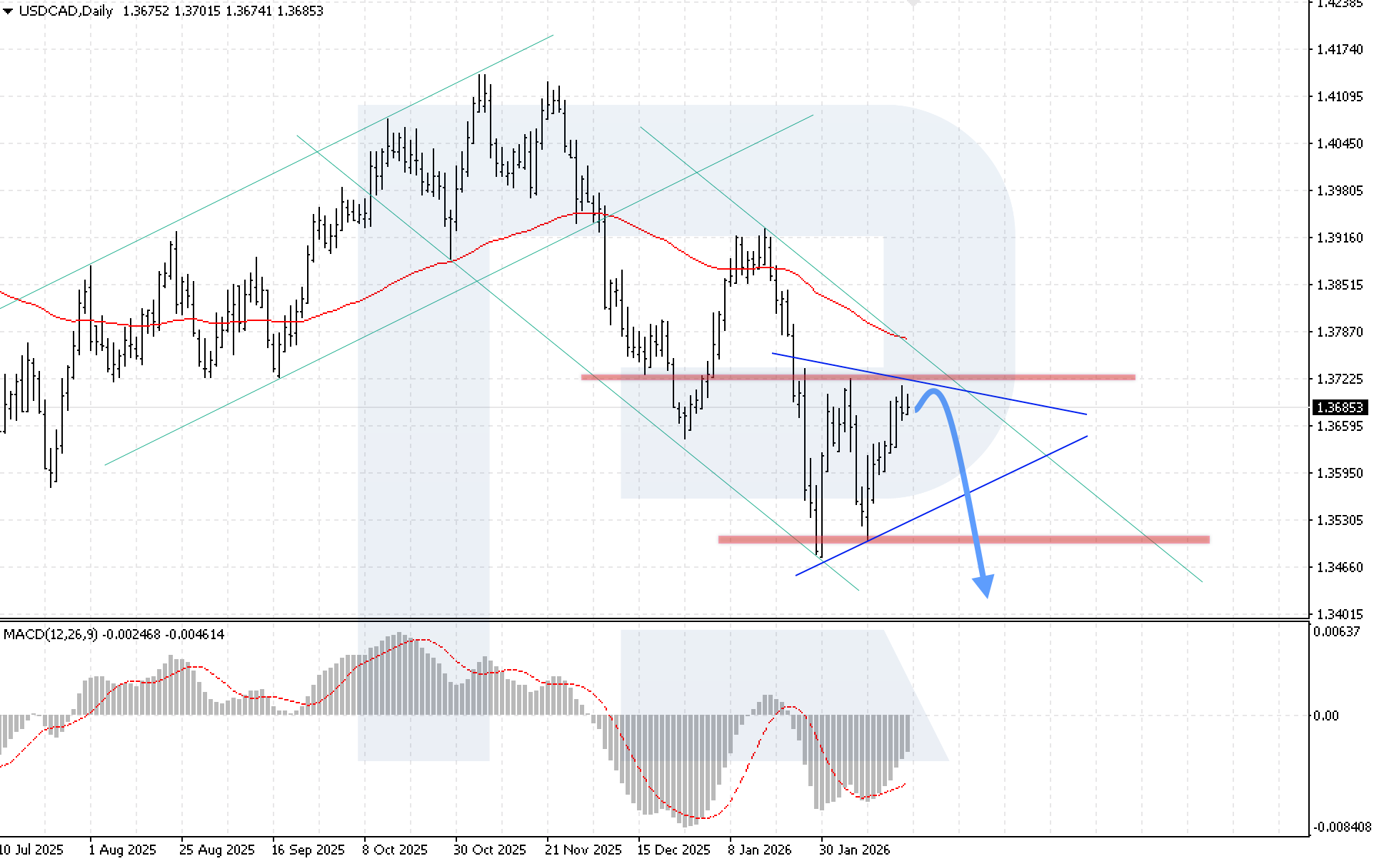 MACD ยืนยันแรงซื้อที่ยังเด่น และชี้ถึงโอกาสทดสอบขอบบนของ Triangle อีกครั้งก่อนกลับลงต่อ ฮิสโตแกรมยังเพิ่มขึ้น หนุนความคาดหวังว่าดอลลาร์สหรัฐอาจแข็งค่าชั่วคราว เงื่อนไขสำคัญของฉากขาลงคือราคาต้องยืนต่ำกว่า 1.3505 การหลุดระดับนี้จะยืนยันการเคลื่อนต่ำกว่าขอบล่างของรูปแบบ และเพิ่มน้ำหนักสัญญาณปรับลงต่อไปยังเป้าหมายด้านล่าง