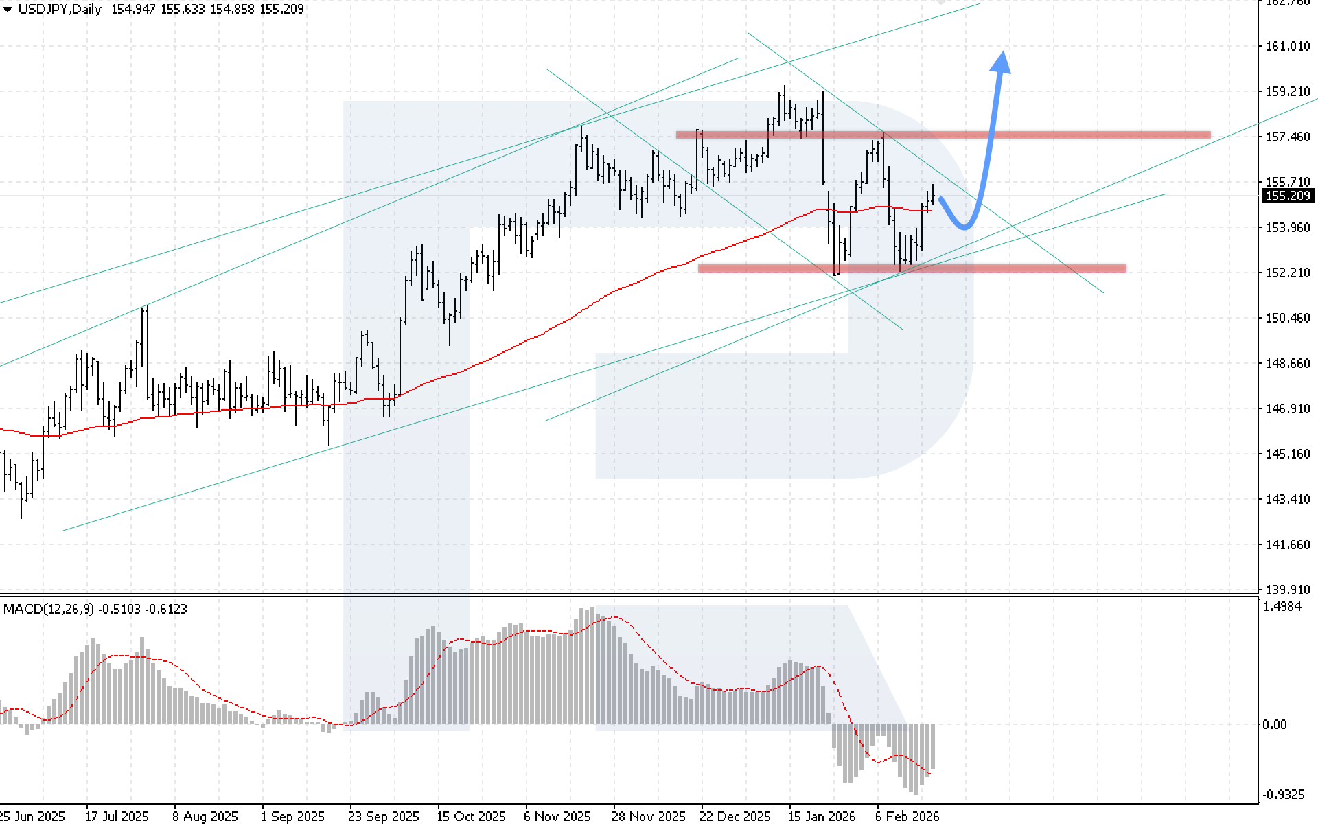 MACD ยืนยันสัญญาณกลับตัว ฮิสโตแกรมเพิ่มขึ้นอย่างชัดเจน และเส้นสัญญาณเคลื่อนออกจากโซนฮิสโตแกรม สะท้อนโมเมนตัมขาขึ้นที่กลับมา เงื่อนไขสำคัญเพื่อยืนยันฉากขาขึ้นสัปดาห์นี้คือราคาต้องยืนเหนือแนวต้าน 156.15 ซึ่งจะเป็นสัญญาณทะลุขอบบนของช่องขาลง