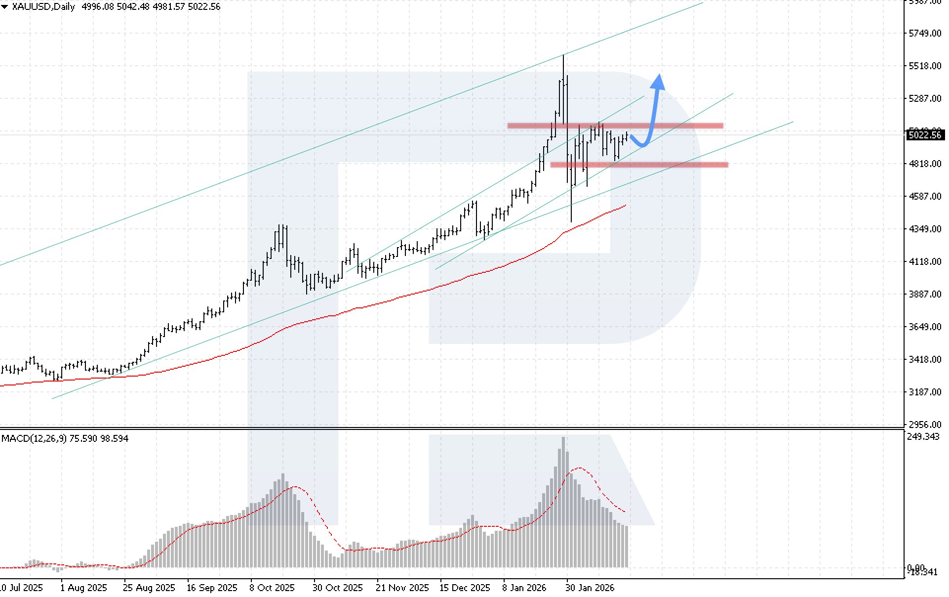 บนกราฟรายวัน XAUUSD ราคายังคงอยู่ในช่วงปรับฐาน แต่แรงซื้อค่อย ๆ เพิ่มขึ้น และผู้ซื้อยังมีโอกาสทดสอบแนวต้านสำคัญ 5,105 USD การกลับขึ้นใหม่ยังมีความเป็นไปได้ช่วงต้นสัปดาห์ โดยมีเป้าหมายที่ 5,575 USD