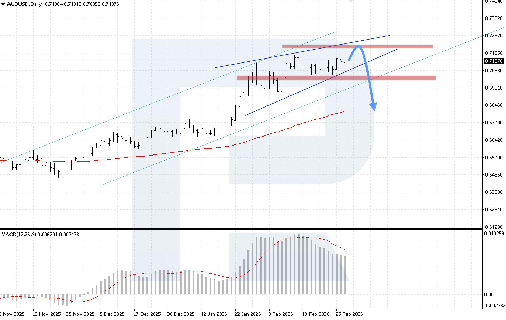 สถานการณ์ขาขึ้น (ทางเลือก): การทะลุเหนือแนวต้านพร้อมการยืนเหนือ 0.7185 จะส่งสัญญาณการเติบโตต่อสู่ 0.7375 และยกเลิกรูปแบบกลับตัว