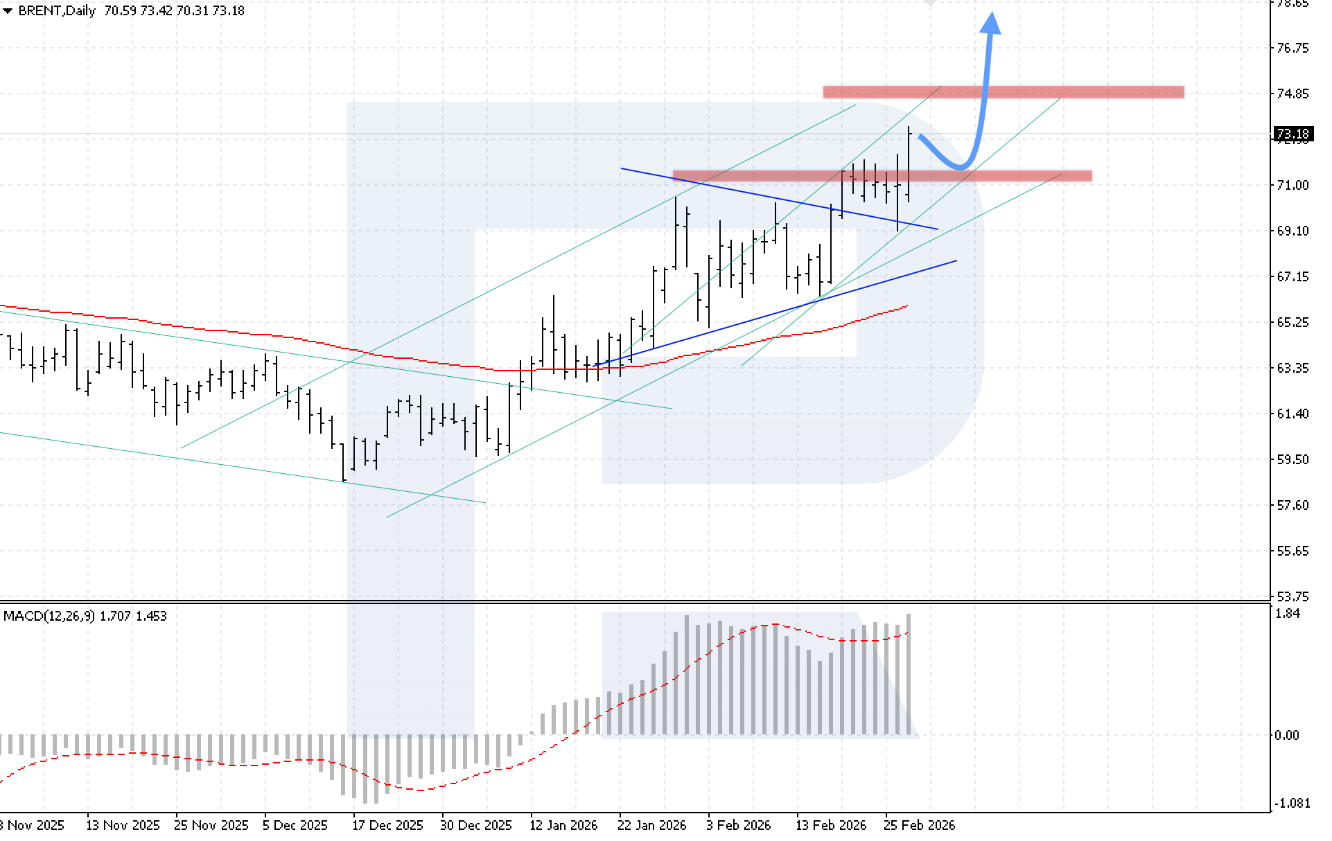 ราคา Brent ยังคงปรับตัวขึ้นหลังจากทะลุเหนือขอบบนของรูปแบบสามเหลี่ยม ตลาดได้รับแรงสนับสนุนจากการที่สหรัฐฯ และอิหร่านตกลงที่จะดำเนินการเจรจาต่อในสัปดาห์หน้า อิหร่านระบุว่าการประชุมล่าสุดในเจนีวาแสดงให้เห็นถึงความคืบหน้าที่น่าสังเกต แต่แหล่งข่าวรายงานถึงความผิดหวังในหมู่เจ้าหน้าที่สหรัฐต่อผลลัพธ์ของการเจรจา