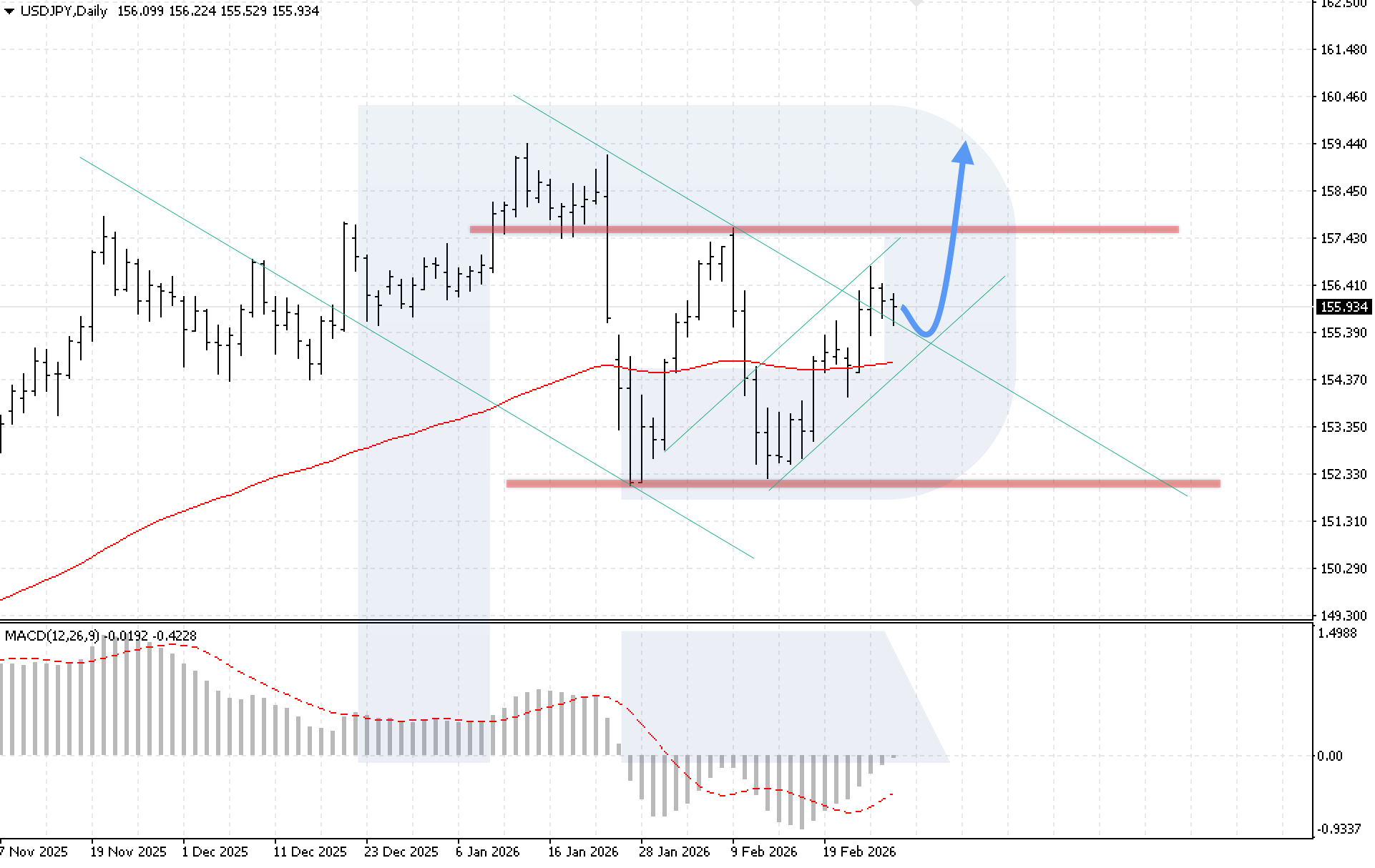 MACD ยืนยันพลวัตเชิงบวก: ฮิสโตแกรมเพิ่มขึ้นอย่างต่อเนื่องและเกือบแตะเส้นศูนย์ ส่งสัญญาณแรงกดดันฝั่งขายที่อ่อนลงและความเป็นไปได้ของการแข็งแกร่งขึ้นของการเคลื่อนไหวขาขึ้น เงื่อนไขสำคัญในการยืนยันสถานการณ์ขาขึ้นในสัปดาห์นี้คือการยืนเหนือแนวต้านที่ 158.05 ซึ่งจะบ่งชี้การทะลุเหนือขอบบนของรูปแบบ Double Bottom และเปิดทางสู่การเคลื่อนไหวตามสัญญาณของรูปแบบ โดยมีเป้าหมายที่ระดับสูงกว่า