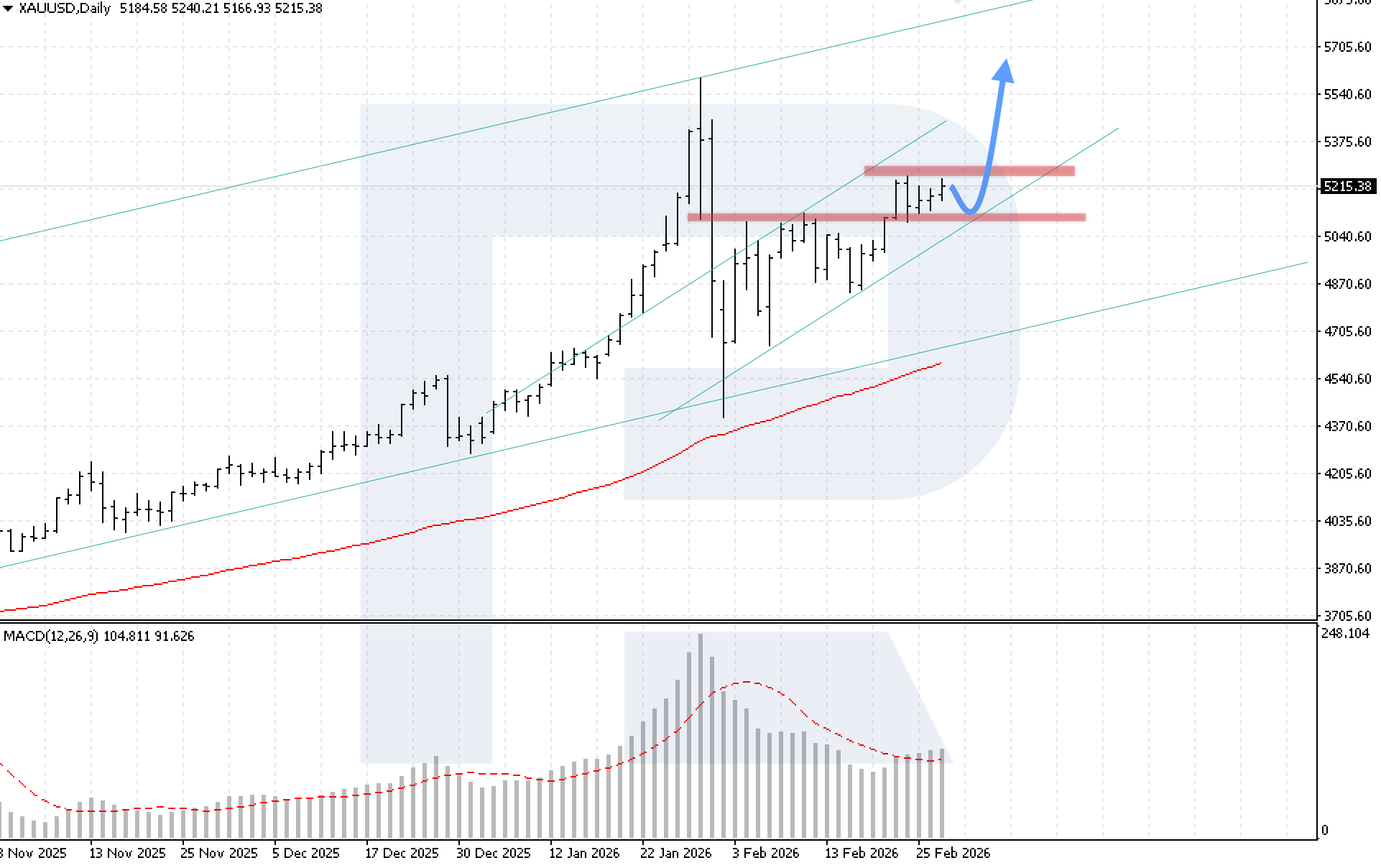 บนกราฟรายวัน XAUUSD แรงกดดันขาขึ้นกำลังเพิ่มขึ้น ผู้ซื้อกำลังทดสอบแนวต้านใกล้ที่สุดที่ 5,220 USD อย่างแข็งขัน ขณะที่ราคายังคงอยู่ภายในช่องขาขึ้น ในช่วงต้นสัปดาห์ การปรับตัวขึ้นต่อยังคงมีความเป็นไปได้ โดยมีเป้าหมายที่ 5,625 USD