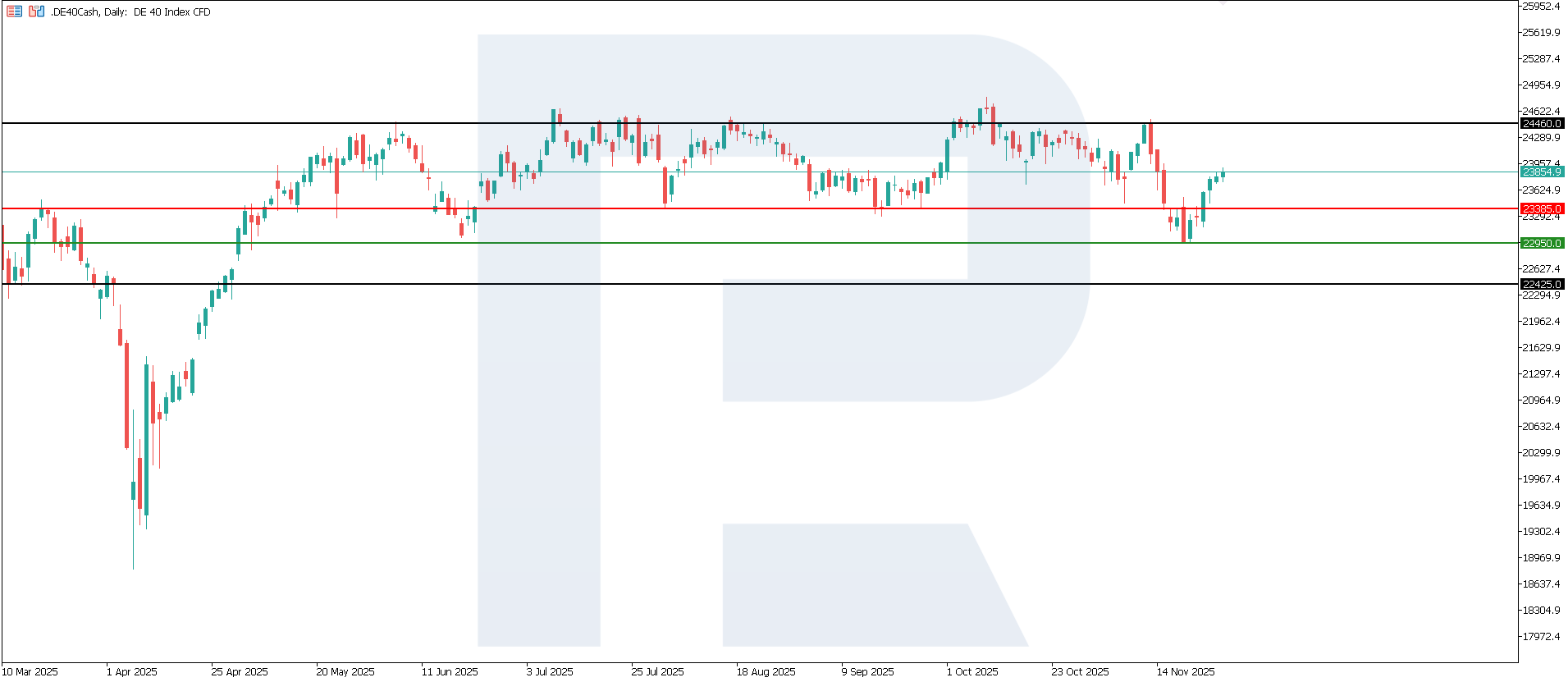 ดัชนี DE 40 ทะลุแนวต้านสำคัญที่ 23,385.0 และสร้างแนวรับใหม่ที่ 22,950.0 แนวโน้มหลักยังเป็นขาขึ้น แต่ระยะเวลาของแนวโน้มยังไม่ชัดเจน เป้าหมายถัดไปด้านบนอยู่ที่ 24,460.0