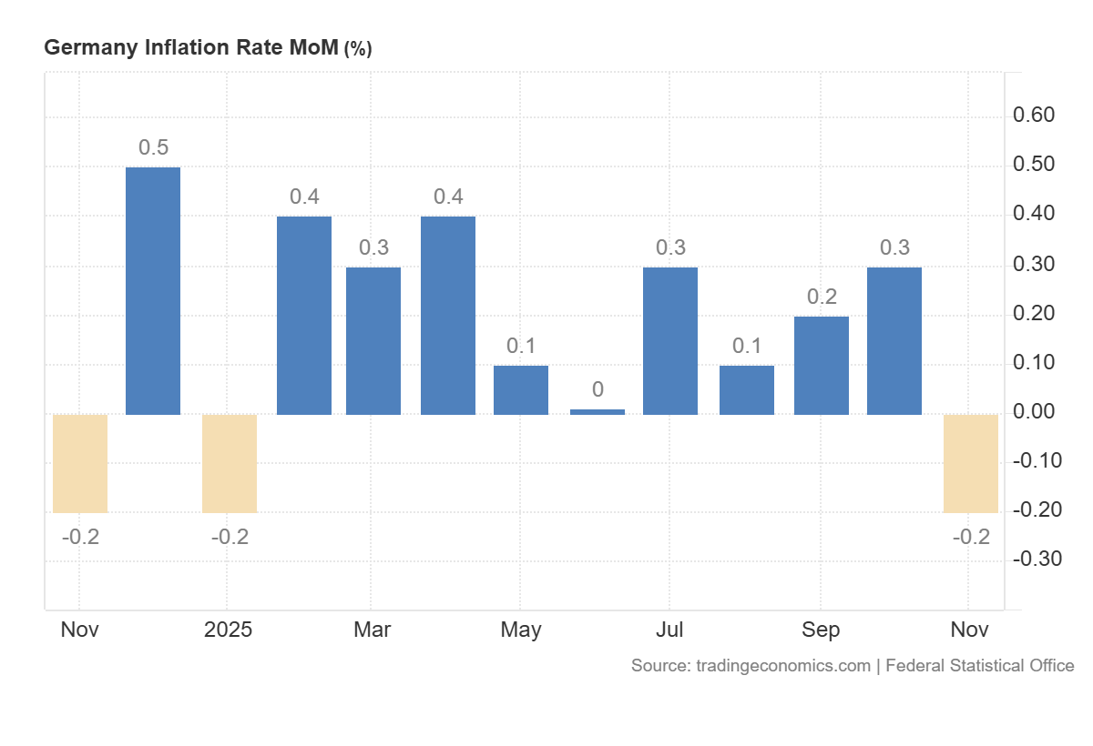 เยอรมนีรายงานการเปลี่ยนแปลงของดัชนีราคาผู้บริโภค (CPI) รายเดือนที่ -0.2% m/m ตัวเลขดังกล่าวสอดคล้องกับที่ตลาดคาดการณ์ไว้ (-0.2%) แต่ลดลงอย่างมีนัยสำคัญจากค่าก่อนหน้าที่ +0.3% ในเชิงปฏิบัติ นี่สะท้อนถึงการลดลงของราคาผู้บริโภคในระยะสั้น และแรงกดดันด้านเงินเฟ้อที่ผ่อนคลายลงเมื่อเทียบกับเดือนก่อนหน้า สำหรับตลาดหุ้นเยอรมนี ช่องทางการส่งผ่านที่สำคัญคือความคาดหวังเกี่ยวกับอัตราดอกเบี้ยและอัตราผลตอบแทนพันธบัตร โดยทั่วไป เงินเฟ้อที่ลดลงจะช่วยลดความเป็นไปได้ที่ยูโรโซนจำเป็นต้องคงอัตราดอกเบี้ยในระดับสูงเป็นเวลานาน