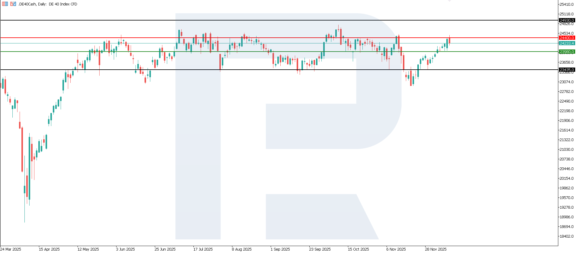 โดยรวมแล้ว การประกาศตัวเลข CPI ล่าสุดถือเป็นปัจจัยสนับสนุนระดับปานกลางต่อดัชนี DE 40 ในแง่ของความเสี่ยงด้านเงินเฟ้อและความคาดหวังเกี่ยวกับอัตราดอกเบี้ย อย่างไรก็ตาม เนื่องจากตัวเลขออกมาตรงตามที่ตลาดคาดการณ์ไว้ จึงไม่ใช่ปัจจัยเดี่ยวที่กระตุ้นให้ตลาดเคลื่อนไหวรุนแรง สำหรับนักลงทุน คำถามสำคัญคือ แนวโน้มการผ่อนคลายของแรงกดดันด้านราคาจะได้รับการยืนยันจากข้อมูลในระยะถัดไปหรือไม่ และจะมาพร้อมกับข้อมูลเศรษฐกิจและตลาดแรงงานที่มีเสถียรภาพหรือไม่ เป้าหมายขาขึ้นที่ใกล้ที่สุดของดัชนีอยู่ที่ 24,980.0