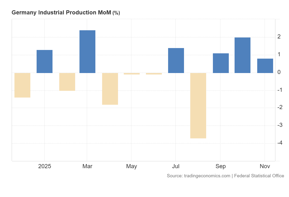 ตัวชี้วัดการผลิตภาคอุตสาหกรรมของเยอรมนีออกมาอยู่ที่ 0.8% เมื่อเทียบรายเดือน ซึ่งดีกว่าที่ตลาดคาดการณ์ไว้อย่างมากที่คาดว่าจะหดตัว 0.6% สำหรับตลาดหุ้น ตัวเลขนี้ถือเป็นเซอร์ไพรส์เชิงบวกด้านการเติบโต ซึ่งช่วยลดความเสี่ยงของการชะลอตัวทางเศรษฐกิจอย่างรุนแรงในช่วงเดือนข้างหน้า และปรับปรุงความคาดหวังระยะสั้นเกี่ยวกับรายได้และอัตรากำไรของบริษัทที่อ่อนไหวต่อวัฏจักรเศรษฐกิจ การประกาศข้อมูลลักษณะนี้มักสนับสนุนความต้องการรับความเสี่ยง และเพิ่มความเต็มใจของนักลงทุนในการเข้าซื้อหุ้นกลุ่มอุตสาหกรรมและบริษัทที่มุ่งเน้นการส่งออก