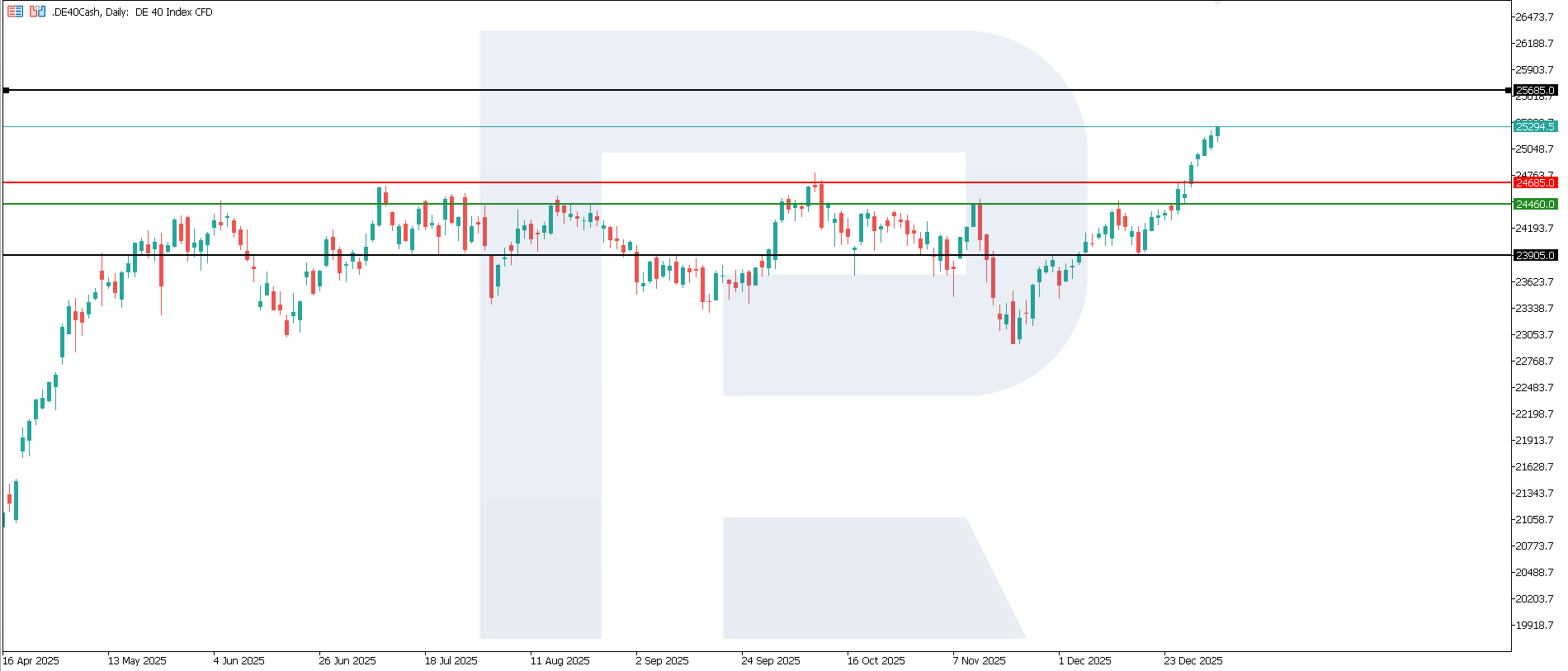 สำหรับดัชนี DE 40 ระดับแนวต้านสำคัญบริเวณ 24,685.0 ได้ถูกทะลุขึ้นแล้ว โดยยังไม่มีแนวต้านใหม่ที่ชัดเจนก่อตัวขึ้น ระดับแนวรับอยู่ใกล้บริเวณ 24,460.0 แนวโน้มขาขึ้นที่แข็งแกร่งกำลังครอบงำตลาด และราคายังคงทำจุดสูงสุดใหม่ตลอดกาลอย่างต่อเนื่อง เป้าหมายขาขึ้นที่ใกล้ที่สุดอยู่ที่ระดับ 26,685.0