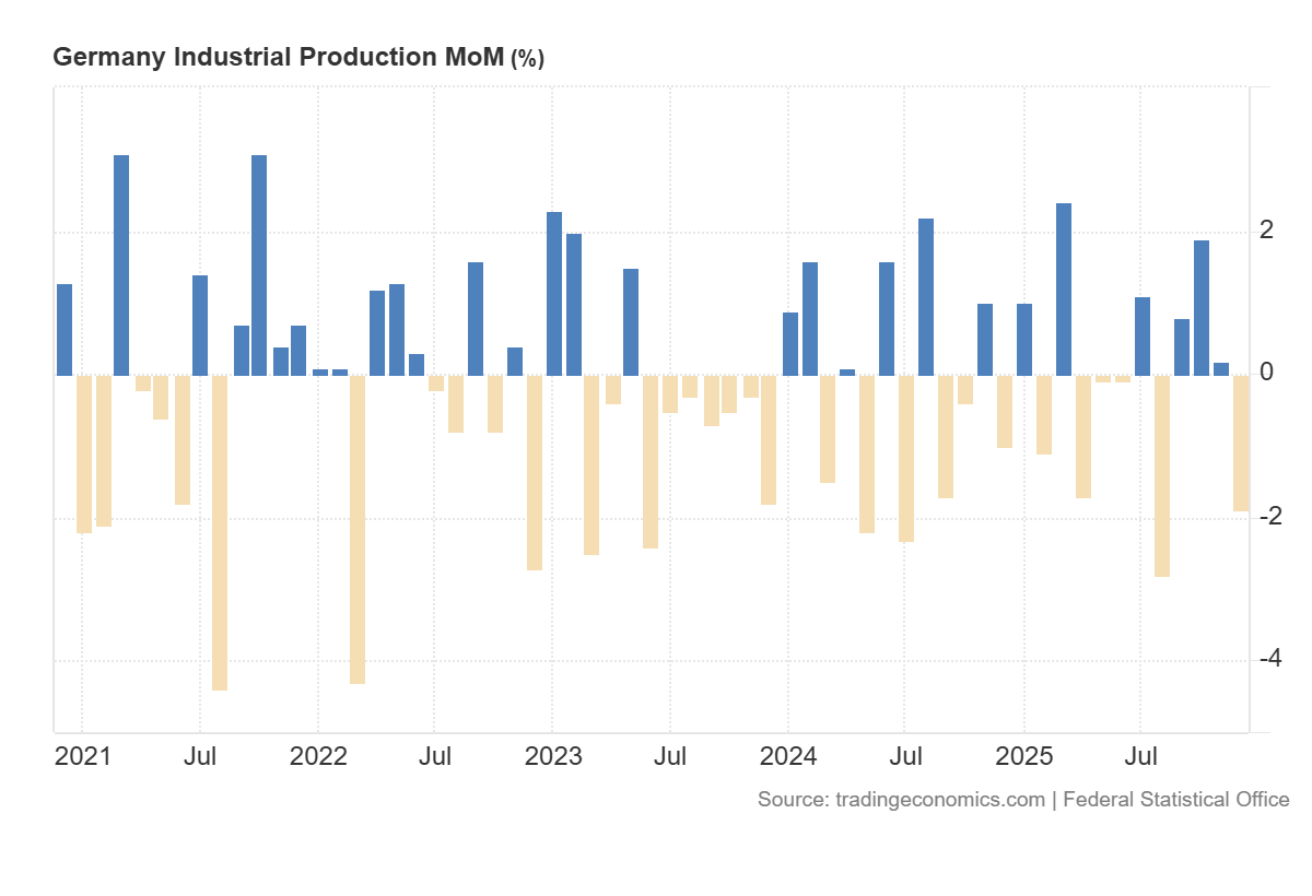 ข้อมูลการผลิตภาคอุตสาหกรรมของเยอรมนีออกมาอ่อนแอกว่าที่คาดการณ์ไว้มาก โดยลดลง −1.9% m/m เทียบกับที่ตลาดคาดไว้เพียง −0.2% และจากค่าก่อนหน้าที่ +0.2% สำหรับดัชนี DE 40 ผลลัพธ์นี้มักสะท้อนถึงการเสื่อมถอยของบรรยากาศการลงทุนในระยะสั้น เนื่องจากตัวชี้วัดดังกล่าวเชื่อมโยงโดยตรงกับกิจกรรมทางธุรกิจ การใช้กำลังการผลิต และแนวโน้มกำไรของบริษัทในอนาคตในเศรษฐกิจที่พึ่งพาภาคอุตสาหกรรมเป็นหลัก