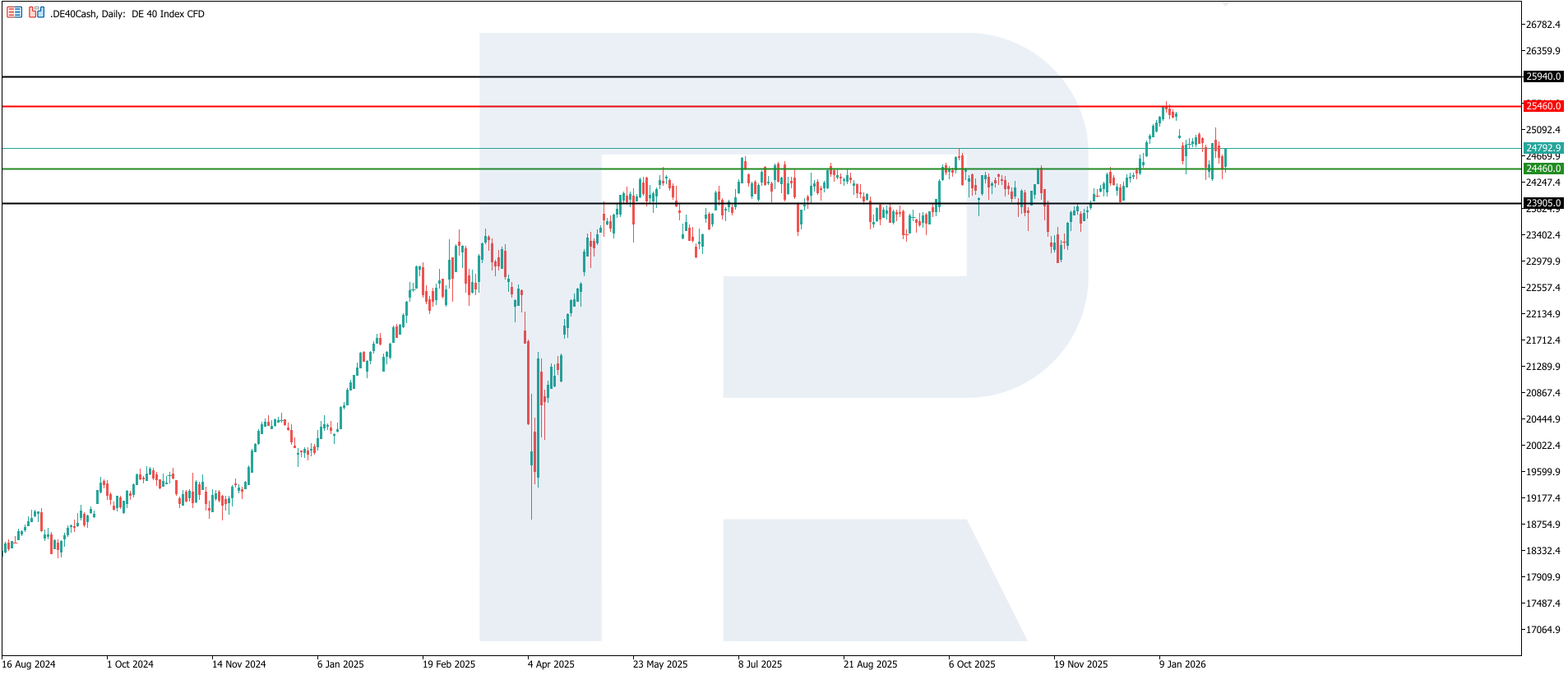 สำหรับดัชนี DE 40 ระดับแนวต้านสำคัญอยู่ที่ 25,460.0 ขณะที่ระดับแนวรับหลักอยู่บริเวณ 24,460.0 เมื่อไม่นานมานี้ ดัชนีอยู่ในช่วงการปรับฐานและได้ทดสอบโซนแนวรับ หากเกิดการฟื้นตัว เป้าหมายขาขึ้นที่ใกล้ที่สุดอาจอยู่ที่ระดับ 25,940.0