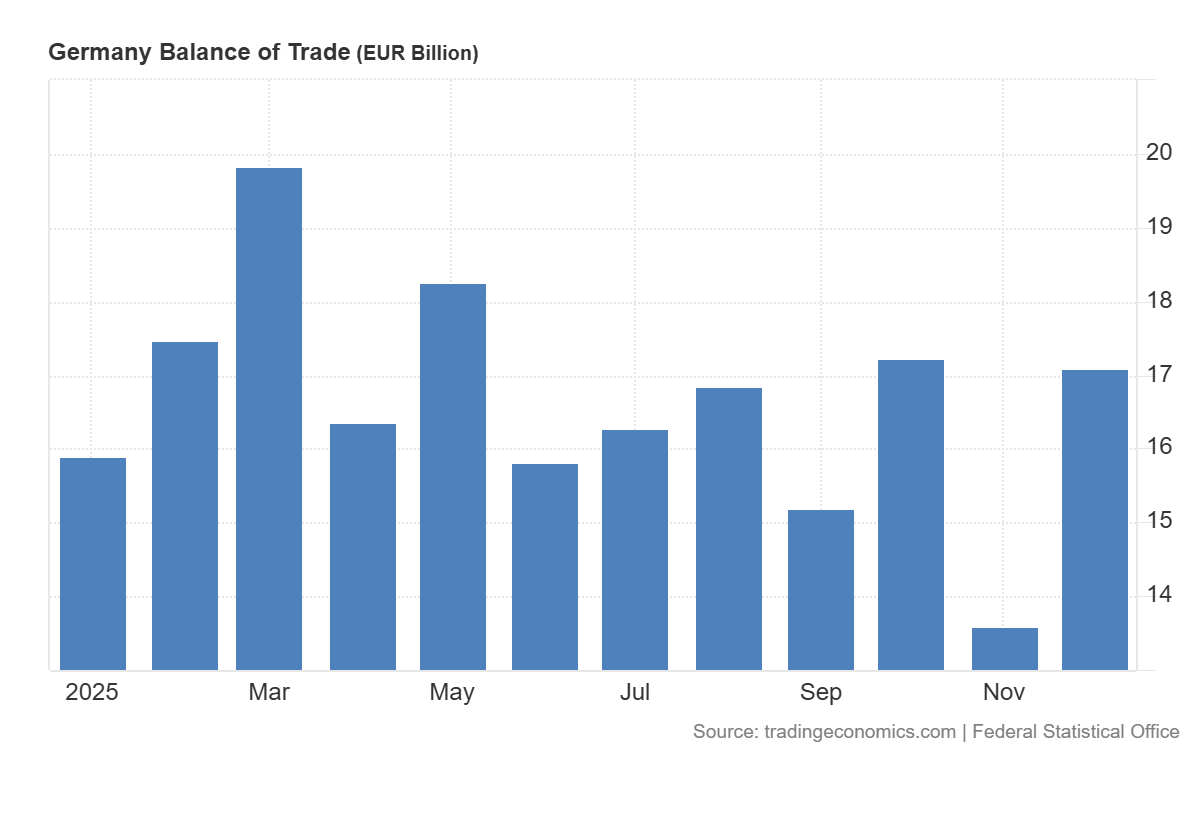 ข้อมูลดุลการค้าของเยอรมนีออกมาดีกว่าที่คาดการณ์ โดยตัวเลขจริงอยู่ที่ 17.1 พันล้านยูโร สูงกว่าคาดการณ์ที่ 14.1 พันล้านยูโร และสูงกว่าค่าก่อนหน้า สำหรับดัชนี DE 40 ผลลัพธ์ลักษณะนี้โดยทั่วไปถือเป็นสัญญาณเชิงบวกในระดับปานกลาง เนื่องจากสะท้อนถึงความยืดหยุ่นของอุปสงค์ภายนอกต่อสินค้าจากเยอรมนี และศักยภาพการส่งออกที่ยังคงอยู่ของเศรษฐกิจที่ใหญ่ที่สุดในยูโรโซน ในทางปฏิบัติ สิ่งนี้สนับสนุนความคาดหวังด้านรายได้และกระแสเงินสดของบริษัทที่มุ่งเน้นตลาดต่างประเทศ ซึ่งมีสัดส่วนสำคัญในดัชนีหุ้นเยอรมนี