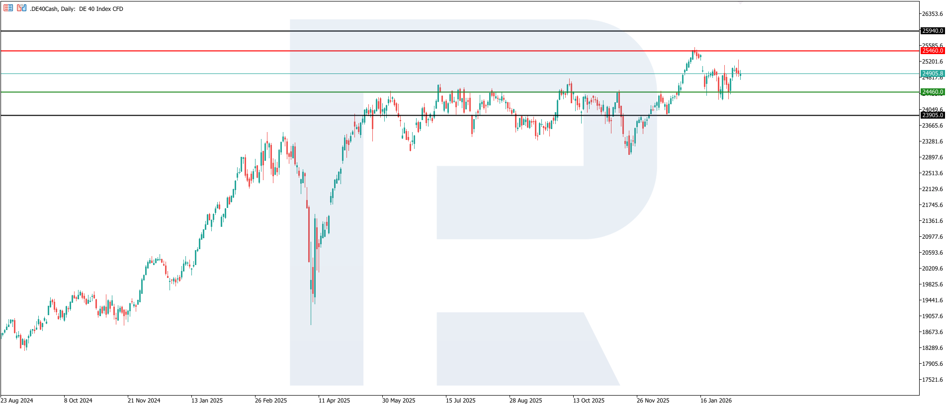 สำหรับดัชนี DE 40 ระดับแนวต้านสำคัญอยู่ที่ 25,460.0 ขณะที่แนวรับหลักอยู่บริเวณ 24,460.0 ในช่วงการซื้อขายล่าสุด ดัชนีอยู่ในช่วงปรับฐานและได้ทดสอบแนวรับแล้ว หากการฟื้นตัวดำเนินต่อไป เป้าหมายขาขึ้นถัดไปอาจอยู่ที่ 25,940.0