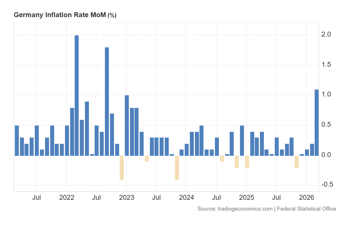 การประกาศตัวเลข CPI ของเยอรมนีในเดือนมีนาคม ซึ่งเพิ่มขึ้น 1.1% เมื่อเทียบรายเดือน หลังจากก่อนหน้านี้อยู่ที่ 0.2% ดูเหมือนจะมีผลเชิงลบอย่างระมัดระวังต่อ DE 40 แม้ว่าผลกระทบจะไม่เท่ากันในทุกหุ้น ที่สำคัญ ตัวเลขนี้ตรงตามการคาดการณ์ จึงไม่ใช่ความประหลาดใจต่อตลาด แต่เป็นการยืนยันว่าแรงกดดันด้านเงินเฟ้อได้เพิ่มขึ้น อัตราเงินเฟ้อรายปีเร่งตัวขึ้นเป็น 2.7% และเงินเฟ้อพื้นฐานอยู่ที่ 2.5% ซึ่งสะท้อนถึงไม่เพียงแค่ผลกระทบจากองค์ประกอบที่ผันผวน แต่ยังรวมถึงแรงกดดันด้านราคาที่คงอยู่ในระบบเศรษฐกิจ