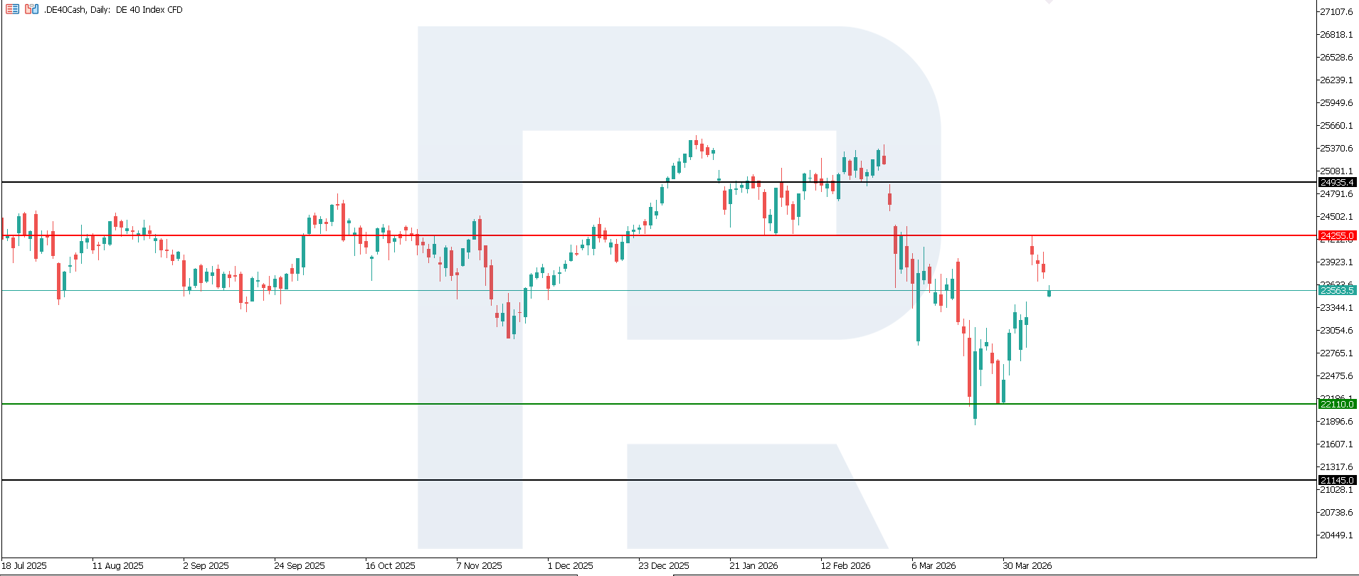 ในดัชนี DE 40 แนวต้านก่อตัวบริเวณ 24,255.0 ขณะที่แนวรับอยู่ที่ 22,110.0 ราคาอยู่ในช่วงปรับฐานและอาจกลับมาปรับขึ้นในระยะสั้น หากการปรับขึ้นดำเนินต่อไป เป้าหมายอาจอยู่ที่ 24,935.0
