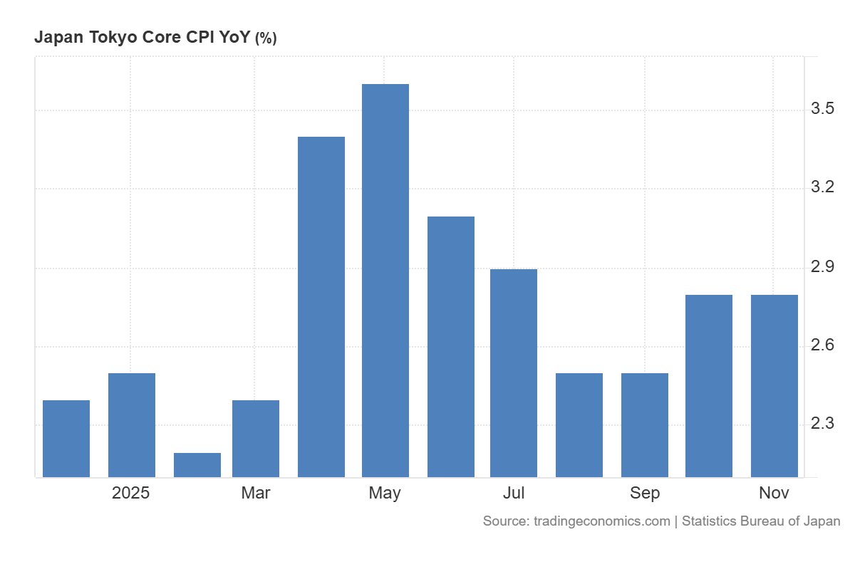 ข้อมูลเงินเฟ้อพื้นฐานล่าสุดของกรุงโตเกียวแสดงการเพิ่มขึ้น 2.8% เมื่อเทียบรายปี เท่ากับค่าก่อนหน้าและสูงกว่าคาดการณ์เล็กน้อยที่ 2.7% หมายความว่าเงินเฟ้อไม่ได้เร่งตัวขึ้นแต่ก็ไม่ชะลอตัว ยังคงอยู่เหนือเป้าหมาย 2.0% ของธนาคารกลางญี่ปุ่นอย่างต่อเนื่อง สำหรับตลาดหุ้น นี่หมายถึงความเสี่ยงด้านเงินฝืด (deflation) ลดลง: บริษัทต่าง ๆ ยังคงสามารถปรับขึ้นราคาสินค้าได้ อุปสงค์ภายในประเทศยังแข็งแรงพอสมควร และรายได้ภาคผู้บริโภคยังได้รับแรงสนับสนุน ในขณะเดียวกัน เงินเฟ้อที่ทรงตัวในระดับไม่สูงเกินไปยังลดความเสี่ยงที่เศรษฐกิจจะชะลอตัวอย่างรุนแรงจากการเข้มงวดนโยบายการเงิน