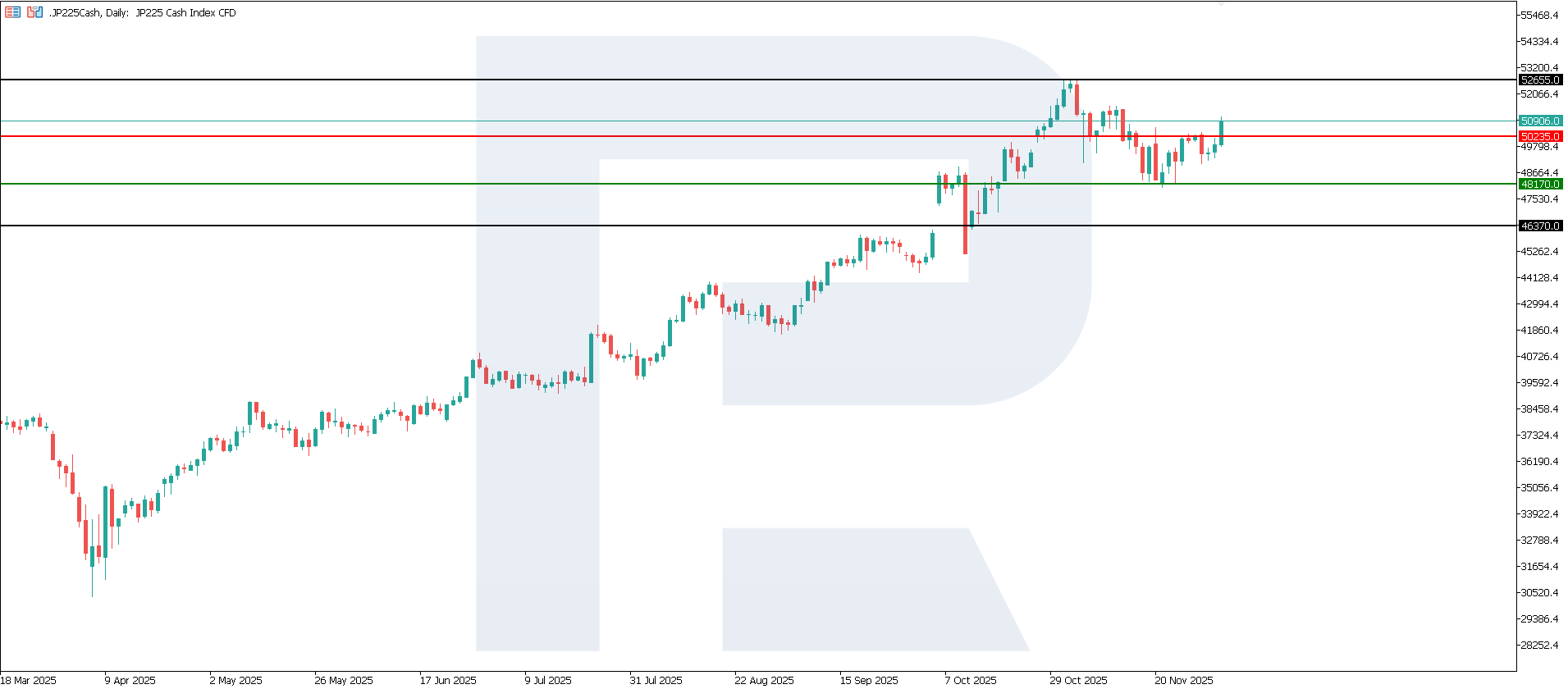 ดัชนีราคาผู้บริโภคพื้นฐานของกรุงโตเกียว (เทียบปีต่อปี) https://tradingeconomics.com/japan/tokyo-core-cpiระหว่างการปรับฐานครั้งล่าสุด ดัชนี JP 225 เด้งกลับจากระดับแนวรับ 48,170.0 ก่อนที่จะกลับขึ้นต่อ ดัชนีอาจแกว่งตัวออกด้านข้างช่วงหนึ่ง ขณะที่แนวโน้มขาขึ้นระยะยาวยังคงอยู่ ระดับแนวต้านใกล้ที่สุดก่อตัวที่ 50,235.0 และเป้าหมายขาขึ้นถัดไปอยู่ที่ 52,655.0