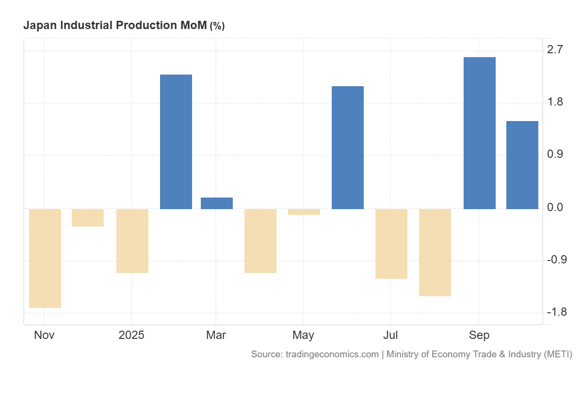 ข้อมูลการผลิตภาคอุตสาหกรรมของญี่ปุ่น (MoM) ออกมาอยู่ที่ +1.5% เมื่อเทียบรายเดือน สูงกว่าคาดการณ์ที่ +1.4% หลังจากเพิ่มขึ้น +2.6% ในเดือนก่อนหน้า ซึ่งหมายความว่าผลผลิตภาคอุตสาหกรรมเติบโตเร็วกว่าที่คาดเล็กน้อย แม้อัตราการเติบโตจะชะลอลงเมื่อเทียบกับช่วงก่อนหน้า โดยทั่วไป การเพิ่มขึ้นของการผลิตสะท้อนถึงคำสั่งซื้อที่มากขึ้น การใช้กำลังการผลิตที่สูงขึ้น และโอกาสที่บริษัทต่าง ๆ จะสร้างรายได้และกำไรที่แข็งแกร่งในไตรมาสถัดไป