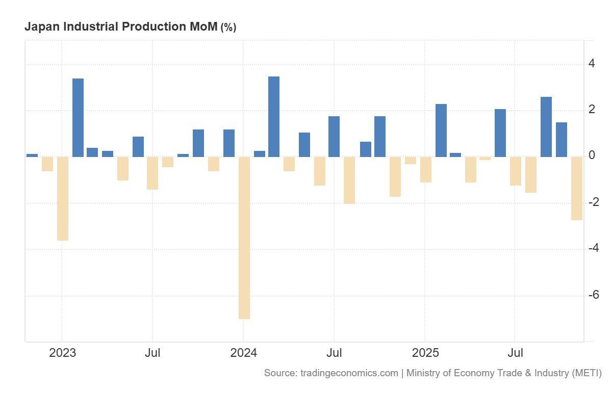 การผลิตภาคอุตสาหกรรมของญี่ปุ่นลดลง −2.7% เมื่อเทียบรายเดือน แย่กว่าที่คาดการณ์ไว้เล็กน้อยที่ −2.6% หลังจากเดือนก่อนหน้าขยายตัว 1.5% จากมุมมองของตลาดหุ้น ถือเป็นสัญญาณเชิงลบ เนื่องจากสะท้อนถึงการชะลอตัวของผลผลิตในภาคเศรษฐกิจจริง และเพิ่มความเสี่ยงต่อผลประกอบการที่อ่อนแอลงในอุตสาหกรรมวัฏจักร ประเด็นสำคัญคือการพลิกกลับจากการเติบโตที่แข็งแกร่งในเดือนก่อนหน้าไปสู่การหดตัวอย่างชัดเจน ซึ่งตอกย้ำภาพของกิจกรรมทางเศรษฐกิจที่เริ่มเย็นตัวลง มากกว่าความผันผวนชั่วคราว