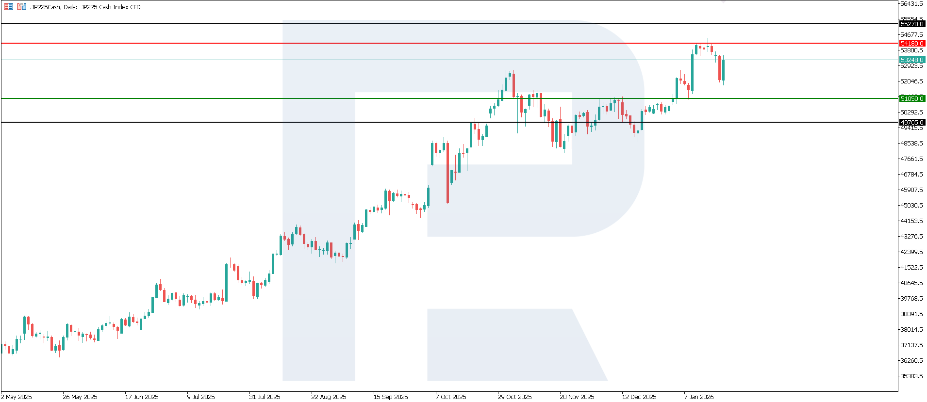 การผลิตภาคอุตสาหกรรมของญี่ปุ่น รายเดือน https://tradingeconomics.com/japan/industrial-production-momดัชนี JP 225 ยังคงรักษาแรงส่งขาขึ้นไว้ได้ โดยมีแนวรับสำคัญที่ระดับ 51,150.0 และแนวต้านที่ใกล้ที่สุดอยู่ที่ 54,180.0 การปรับตัวขึ้นในปัจจุบันมีแนวโน้มสูงที่จะเป็นการเคลื่อนไหวในระยะกลาง โดยเป้าหมายถัดไปอาจอยู่บริเวณ 55,270.0