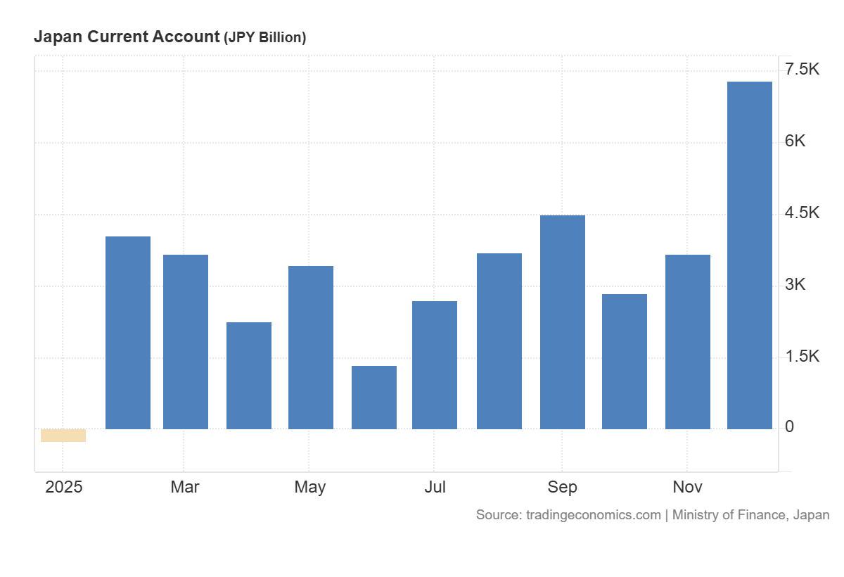 ข้อมูลล่าสุดเกี่ยวกับดุลบัญชีเดินสะพัดของญี่ปุ่นออกมาดีกว่าที่คาดการณ์ไว้อย่างมีนัยสำคัญ โดยตัวเลขจริงอยู่ที่ 7.288 ล้านล้านเยน เทียบกับคาดการณ์ที่ 1.060 ล้านล้านเยน ขณะที่ตัวเลขก่อนหน้าอยู่ที่ 3.674 ล้านล้านเยน ความแตกต่างจากที่คาดการณ์อย่างมากเช่นนี้สะท้อนถึงความแข็งแกร่งของดุลภายนอกประเทศที่สูงกว่าที่ตลาดประเมินไว้