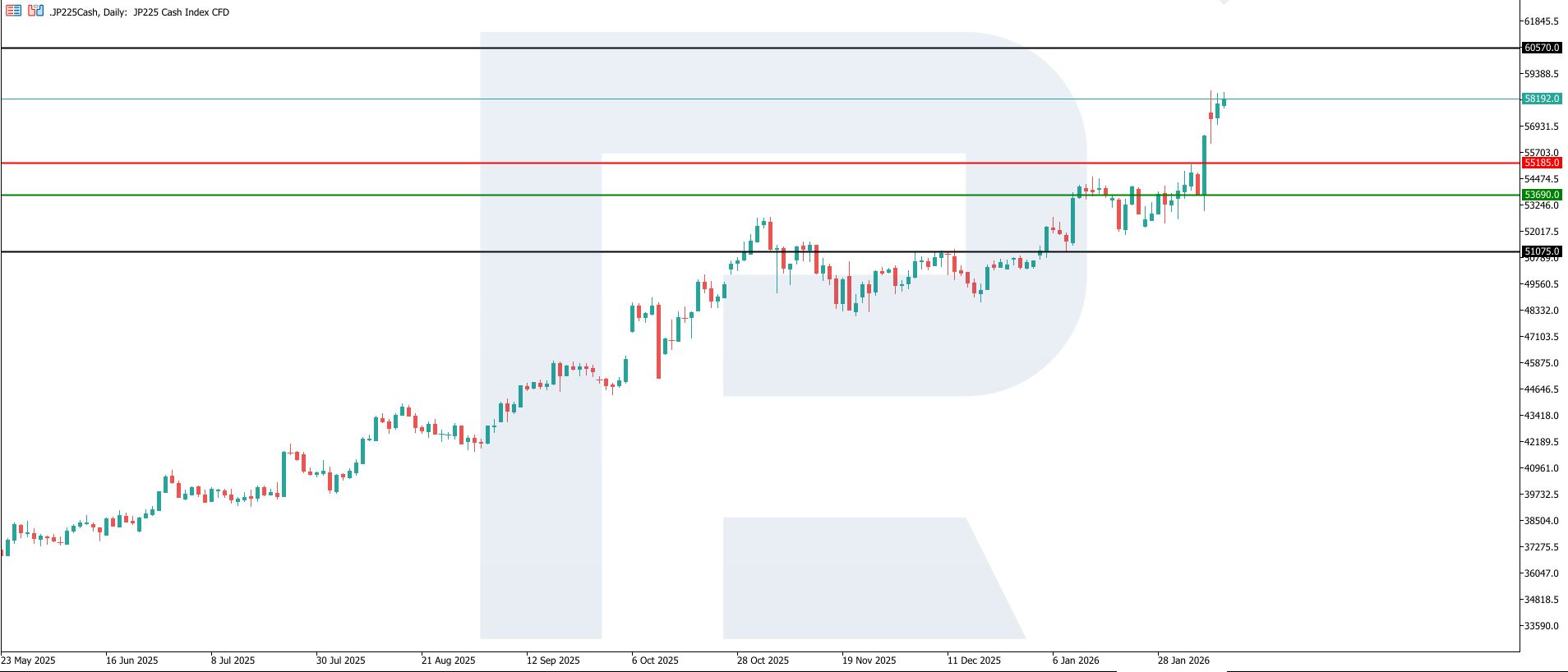 ตัวเลข 7.288 ล้านล้านเยน เมื่อเทียบกับคาดการณ์ที่ 1.060 ล้านล้านเยน และระดับก่อนหน้าที่ 3.674 ล้านล้านเยน ถือเป็นสัญญาณเชิงบวกอย่างชัดเจนต่อการประเมินความแข็งแกร่งทางเศรษฐกิจภายนอกของญี่ปุ่น อย่างไรก็ตาม ผลกระทบต่อ JP 225 ยังมีความไม่แน่นอนจากความเป็นไปได้ที่เงินเยนจะแข็งค่าและผลกระทบต่อบริษัทที่พึ่งพาการส่งออก สำหรับตลาดหุ้นญี่ปุ่น ภาพรวมนี้บ่งชี้ถึงความเป็นไปได้ที่สูงขึ้นของการเคลื่อนไหวที่แตกต่างกันในแต่ละกลุ่มอุตสาหกรรม และการประเมินมูลค่าหุ้นแบบคัดเลือกมากขึ้นในระยะสั้น เป้าหมายขาขึ้นถัดไปของ JP 225 อยู่ที่ระดับ 60,570.0