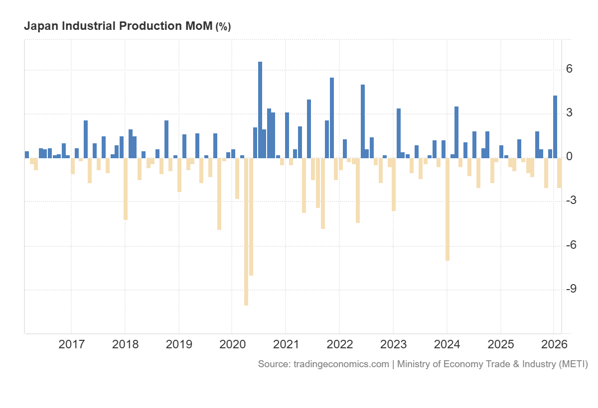 การลดลงของผลผลิตภาคอุตสาหกรรมของญี่ปุ่นที่ 2.0% เมื่อเทียบรายเดือน เมื่อเทียบกับการคาดการณ์ที่ −2.1% โดยรวมออกมาใกล้เคียงกับคาดการณ์ แต่ความแตกต่างอย่างชัดเจนกับการเพิ่มขึ้น 4.3% ในเดือนก่อนหน้าสะท้อนถึงการชะลอตัวของโมเมนตัมในภาคการผลิตอย่างมีนัยสำคัญ ในระดับภาคส่วน แรงกดดันน่าจะเห็นได้ชัดในกลุ่มอุตสาหกรรม วิศวกรรมเครื่องกล อิเล็กทรอนิกส์ และยานยนต์ เนื่องจากกลุ่มเหล่านี้พึ่งพาผลผลิตอุตสาหกรรมโดยตรง
