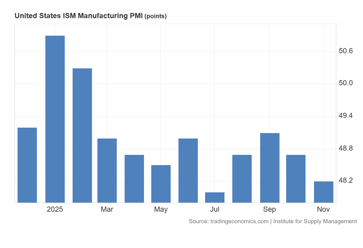 ดัชนี ISM Manufacturing PMI ของสหรัฐอยู่ที่ 48.2 ต่ำกว่าคาดการณ์ที่ 49.0 และลดลงจากครั้งก่อนที่ 48.7 ค่าที่ต่ำกว่า 50.0 บ่งชี้ถึงการหดตัวของกิจกรรมทางธุรกิจ โดยปริมาณคำสั่งซื้อและการผลิตโดยเฉลี่ยลดลง การที่ตัวเลขออกมาต่ำกว่าคาดและลดลงจากเดือนก่อนสะท้อนถึงภาวะชะลอตัวอย่างต่อเนื่อง ไม่ได้ถึงขั้นทรุดหนัก แต่เป็นสัญญาณของความอ่อนแอที่ยืดเยื้อ: โรงงานวางแผนการผลิตอย่างระมัดระวังขึ้น และธุรกิจลงทุนกับการจ้างงานอย่างอนุรักษ์นิยมมากกว่าเดิม