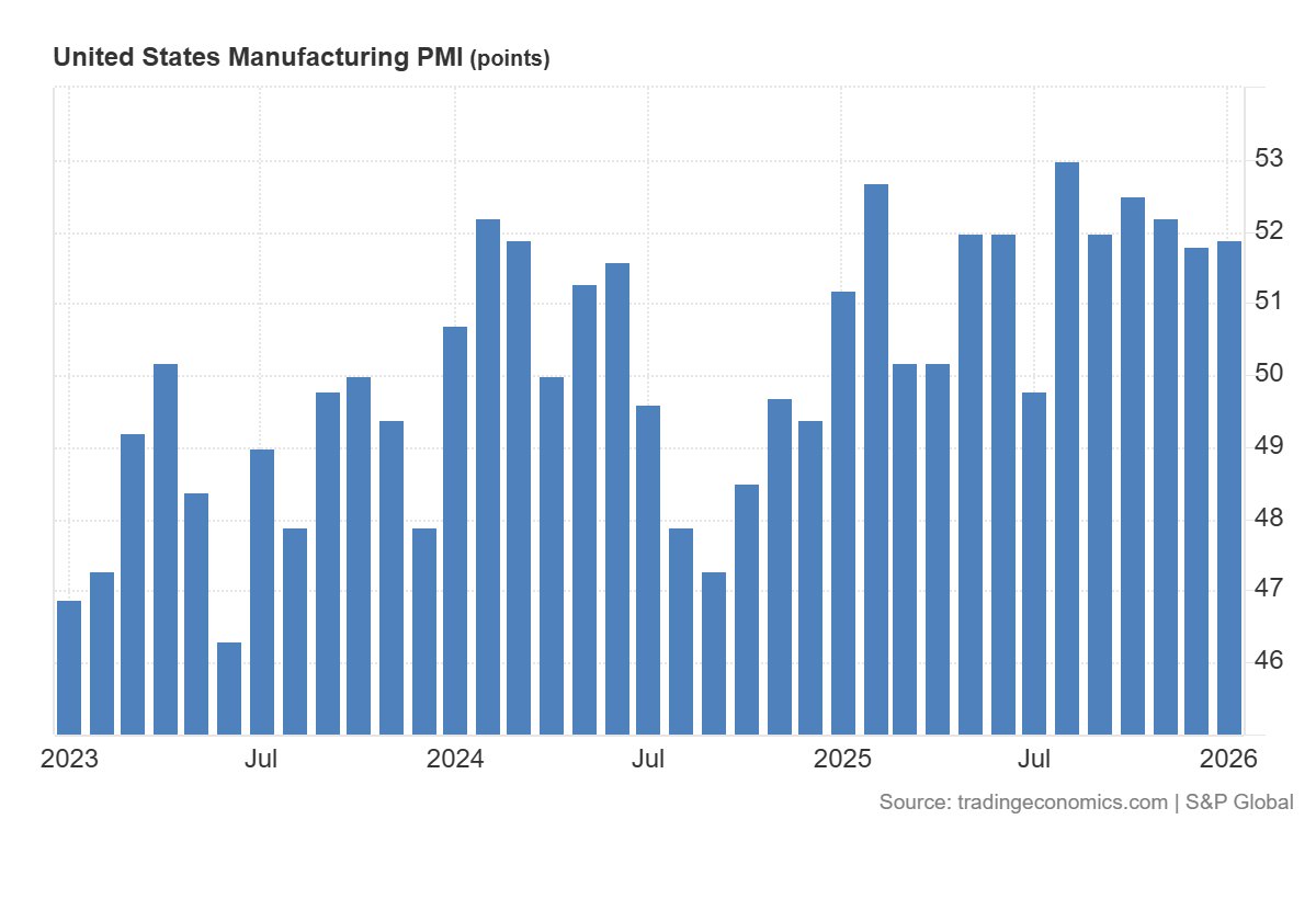 ดัชนี PMI ภาคการผลิตสะท้อนว่ากิจกรรมทางธุรกิจในภาคการผลิตกำลังขยายตัวหรือหดตัว โดยค่าที่สูงกว่า 50.0 บ่งชี้ถึงการเติบโต ขณะที่ค่าต่ำกว่า 50.0 แสดงถึงการหดตัว ในการประกาศล่าสุด ตัวเลขออกมาที่ 51.9 ตรงตามที่ตลาดคาดการณ์ไว้ที่ 51.9 และสูงกว่าค่าก่อนหน้าที่ 51.8 ซึ่งหมายความว่าภาคการผลิตยังคงอยู่ในโซนการเติบโตระดับปานกลาง โดยมีการปรับตัวดีขึ้นเล็กน้อย แต่ไม่มีความประหลาดใจต่อตลาด สำหรับตลาดหุ้นสหรัฐฯ โดยรวม ผลลัพธ์ดังกล่าวมักถูกมองว่าเป็นการยืนยันถึงเสถียรภาพของวัฏจักรเศรษฐกิจ กล่าวคือ อุปสงค์และกิจกรรมการผลิตไม่ได้เสื่อมถอย ซึ่งช่วยสนับสนุนความคาดหวังด้านรายได้และกำไรของภาคธุรกิจ