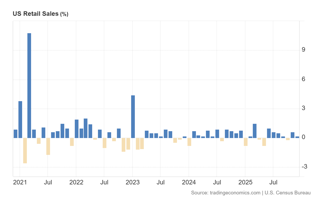 การประกาศยอดค้าปลีกของสหรัฐฯ รายเดือนที่ระดับ 0.0% ซึ่งต่ำกว่าที่คาดการณ์ไว้ที่ 0.4% และต่ำกว่าค่าก่อนหน้าที่ 0.6% ถือเป็นสัญญาณเชิงลบในระยะสั้นต่อดัชนี US 30 ในเชิงมหภาค เนื่องจากสะท้อนถึงการชะลอตัวของอุปสงค์ผู้บริโภคที่ชัดเจนกว่าที่ตลาดคาดการณ์ไว้ ข้อมูลนี้มีความสำคัญอย่างยิ่งต่อดัชนี Dow Jones (US 30) เนื่องจากโครงสร้างของดัชนีประกอบด้วยบริษัทขนาดใหญ่ในภาคเศรษฐกิจจริง ภาคอุตสาหกรรม ภาคผู้บริโภค และภาคการเงิน ซึ่งรายได้และอัตรากำไรมีความอ่อนไหวต่อการใช้จ่ายของครัวเรือนภายในประเทศ