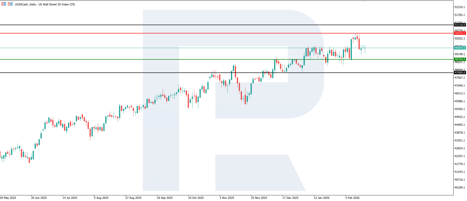 ดัชนี US 30 ได้เข้าสู่แนวโน้มขาขึ้น โดยมีแนวรับสำคัญที่ 48,790.0 และแนวต้านที่ 50,550.0 มีความเสี่ยงที่ดัชนีจะเคลื่อนไหวในกรอบไซด์เวย์ เป้าหมายขาขึ้นถัดไปอยู่ใกล้ระดับ 51,110.0