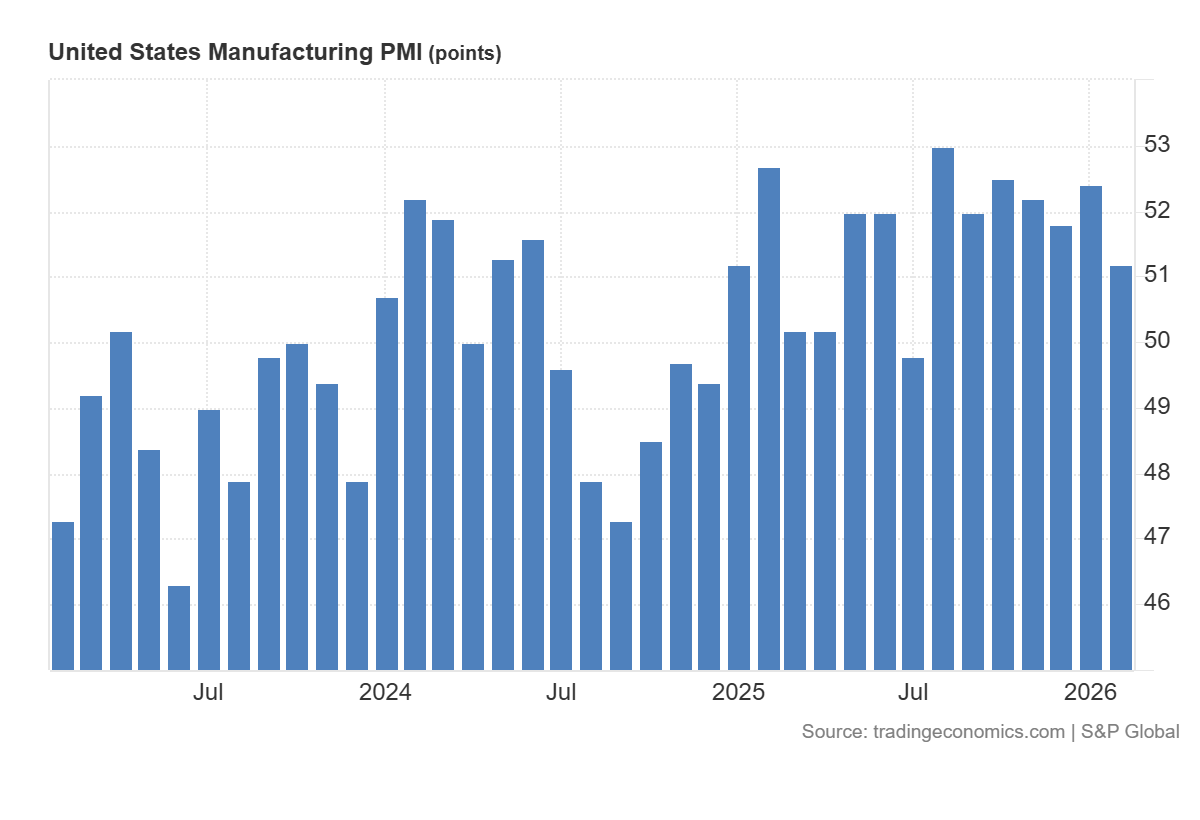 การประกาศดัชนี PMI ภาคการผลิตของสหรัฐฯ ที่ระดับ 51.2 จุด ซึ่งต่ำกว่าที่คาดการณ์ไว้ที่ 52.4 และต่ำกว่าค่าก่อนหน้าที่ 52.4 ถือว่าเป็นปัจจัยลบในระดับปานกลางต่อมุมมองระยะสั้น เนื่องจากบ่งชี้ถึงการชะลอตัวของอัตราการเติบโตในกิจกรรมภาคอุตสาหกรรม อย่างไรก็ตาม ตัวเลขดังกล่าวยังคงอยู่เหนือระดับ 50 จุด ซึ่งหมายความว่าภาคส่วนนี้ยังคงขยายตัวในเชิงทางการ ประเด็นสำคัญจึงเป็นเรื่องของการสูญเสียโมเมนตัมมากกว่าการเข้าสู่ภาวะหดตัว การผสมผสานลักษณะนี้มักถูกตลาดมองว่าเป็นสัญญาณของความต้องการและพลวัตของคำสั่งซื้อในภาคการผลิตที่ระมัดระวังมากขึ้น