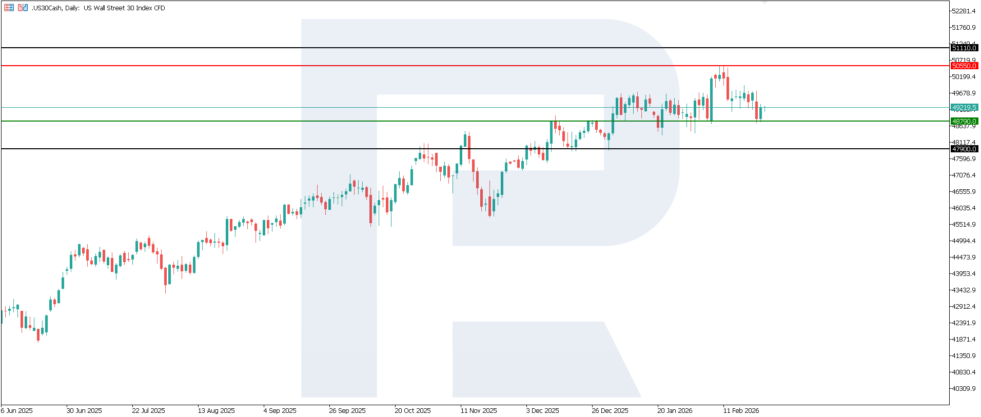 ดัชนี US 30 ได้เข้าสู่แนวโน้มขาขึ้น โดยมีแนวรับสำคัญที่ 48,790.0 และแนวต้านที่ 50,550.0 ขณะนี้ราคากำลังทดสอบระดับแนวรับและเตรียมปรับตัวลงทะลุระดับดังกล่าว เป้าหมายขาลงที่ใกล้ที่สุดอยู่บริเวณ 47,900.0