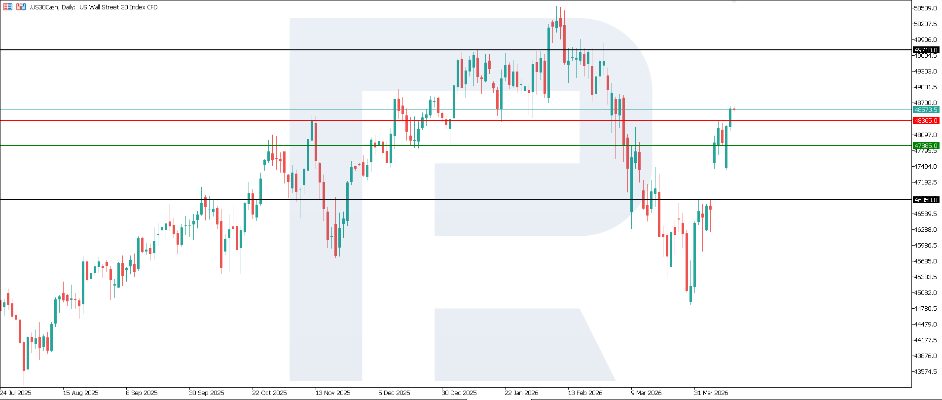 ดัชนี US 30 ได้เข้าสู่แนวโน้มขาขึ้น โดยได้รับแรงหนุนจากความคาดหวังว่าความขัดแย้งระหว่างอิหร่านและสหรัฐอาจสิ้นสุดลงในไม่ช้า การคาดการณ์ US 30 สำหรับวันนี้เป็นบวก