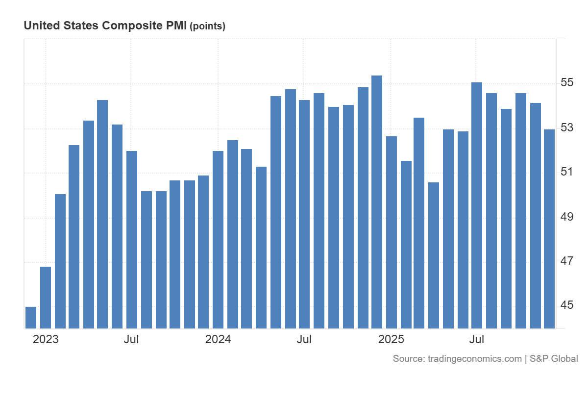 ดัชนี Composite PMI เป็นตัวชี้นำภาวะเศรษฐกิจ โดยค่าที่สูงกว่า 50 บ่งชี้ถึงการขยายตัวของกิจกรรมทางเศรษฐกิจ ขณะที่ค่าต่ำกว่า 50 สะท้อนถึงภาวะหดตัว ค่า PMI ล่าสุดที่ระดับ 53.0 ยืนยันว่าเศรษฐกิจสหรัฐฯ ยังคงเติบโตต่อไป อย่างไรก็ตาม การปรับลดลงเมื่อเทียบกับทั้งคาดการณ์ของตลาด (53.9) และค่าก่อนหน้า (54.2) ชี้ให้เห็นถึงการชะลอตัวของโมเมนตัมการเติบโตเมื่อเทียบกับความคาดหวังของตลาด
