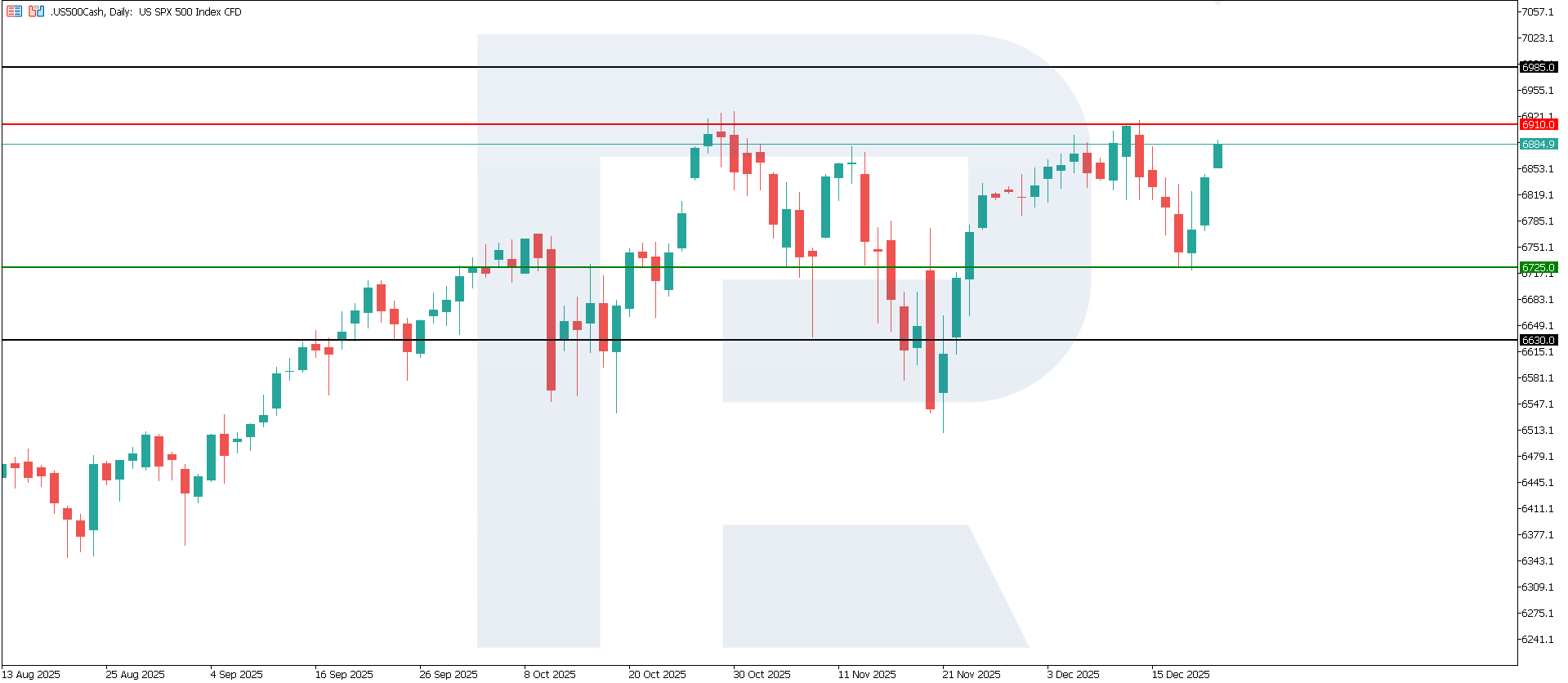ดัชนี US 500 ได้ก่อตัวแนวต้านที่ระดับ 6,910.0 ขณะที่แนวรับที่ 6,725.0 ถูกทะลุลงมาแล้ว การปรับฐานของดัชนีส่งผลให้แนวโน้มเปลี่ยนเป็นขาลง โดยเป้าหมายขาลงที่เป็นไปได้อยู่บริเวณ 6,630.0
