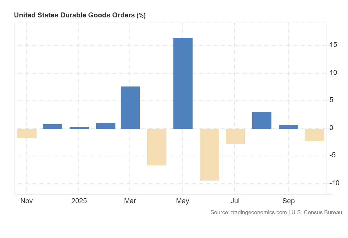 ตัวชี้วัดดังกล่าวปรับตัวลดลง -2.2% เมื่อเทียบรายเดือน ซึ่งออกมาแย่กว่าที่คาดการณ์ไว้ที่ -1.5% และอ่อนแอกว่าค่าก่อนหน้าที่ +0.7% อย่างมีนัยสำคัญ พลวัตนี้สะท้อนถึงความต้องการสินค้าที่ใช้เงินลงทุนสูงที่เริ่มชะลอตัว และอาจเป็นสัญญาณบ่งชี้ถึงการชะลอแผนการลงทุนของภาคธุรกิจในช่วงเดือนข้างหน้า สำหรับตลาดหุ้นสหรัฐฯ ตัวเลขลักษณะนี้มักถือเป็นสัญญาณเชิงลบในระดับปานกลาง โดยเฉพาะต่อภาคส่วนที่พึ่งพาวัฏจักรอุตสาหกรรมและการลงทุนของภาคธุรกิจ นักลงทุนอาจเริ่มสะท้อนการเติบโตของรายได้ที่ระมัดระวังมากขึ้นสำหรับบริษัทอุตสาหกรรมและผู้ผลิตอุปกรณ์ ซึ่งลดระดับความเชื่อมั่นโดยรวมของตลาด