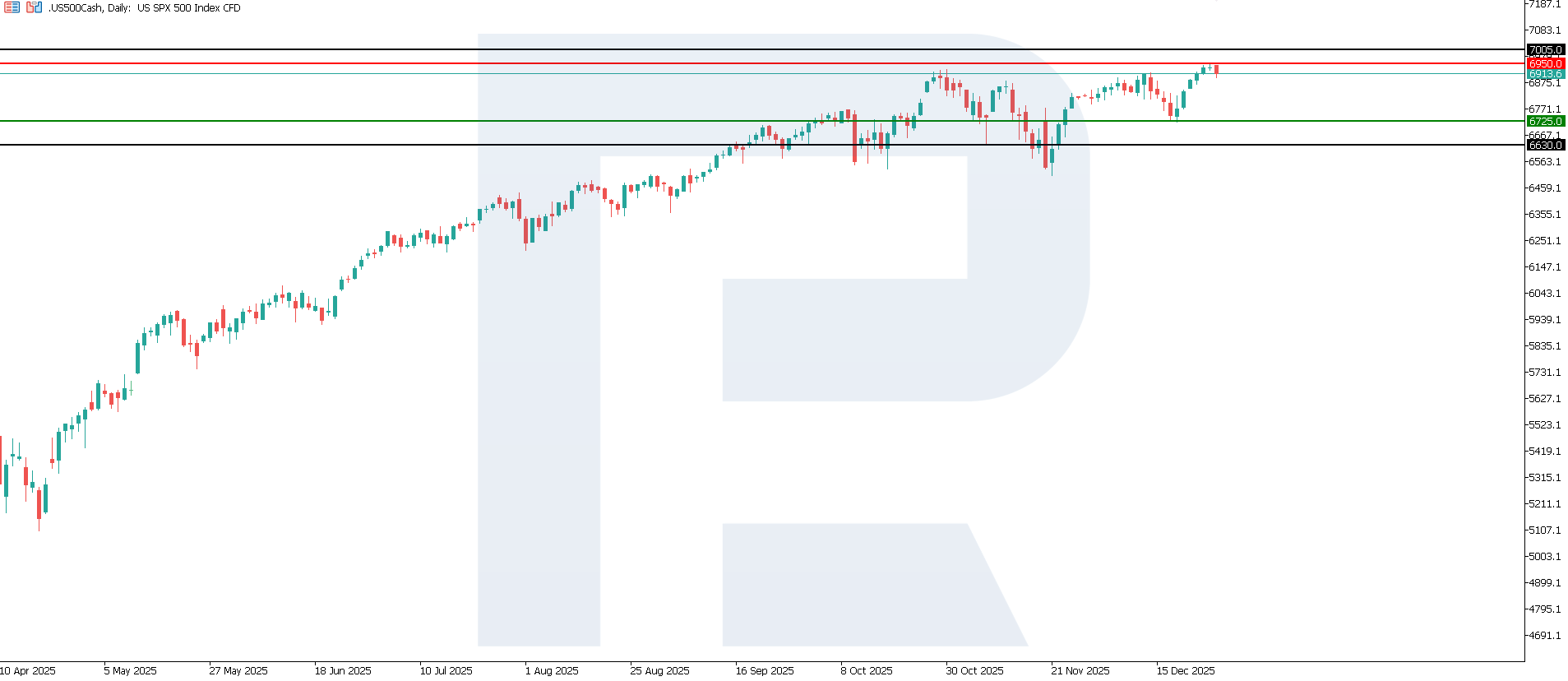 โดยรวมแล้ว ข้อมูลเศรษฐกิจมหภาคล่าสุดสร้างบรรยากาศที่เป็นกลางอย่างระมัดระวังให้กับตลาดหุ้นสหรัฐฯ ซึ่งบ่งชี้ถึงการขาดแรงขับเคลื่อนทิศทางที่ชัดเจน ปัจจัยพื้นฐานในขณะนี้ทั้งสนับสนุนความคาดหวังเกี่ยวกับการผ่อนคลายนโยบายการเงินเพิ่มเติมของธนาคารกลางสหรัฐ และในขณะเดียวกันก็จำกัดความเชื่อมั่นเกี่ยวกับผลการดำเนินงานของภาคธุรกิจ ส่งผลให้ US 500 มีแนวโน้มเคลื่อนไหวโดยมีความอ่อนไหวต่อข้อมูลเศรษฐกิจที่ประกาศออกมาเป็นพิเศษ จากมุมมองทางเทคนิค ดัชนีอาจปรับตัวขึ้นสู่ระดับ 7,005.0