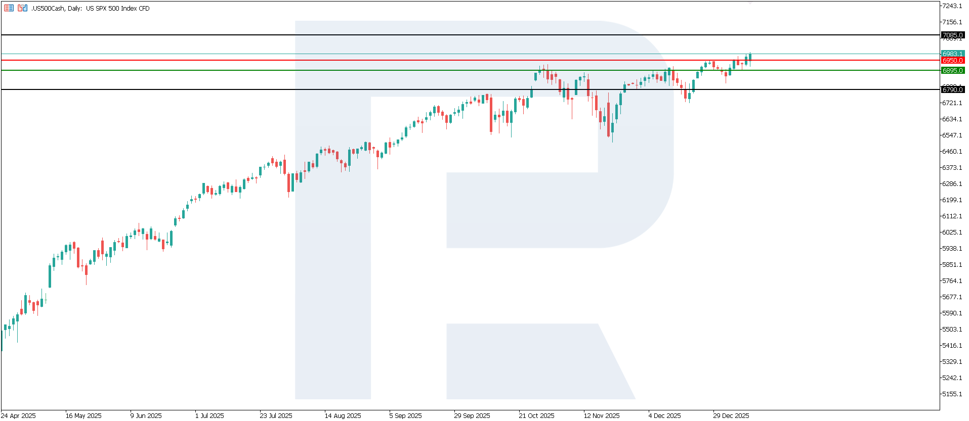 การลดลงของอัตราการว่างงานสู่ระดับ 4.4% โดยทั่วไปถือเป็นสัญญาณเชิงบวกต่อหุ้นสหรัฐฯ เนื่องจากช่วยลดความเสี่ยงของภาวะเศรษฐกิจถดถอย ในขณะเดียวกัน ก็เพิ่มความเป็นไปได้เล็กน้อยที่ธนาคารกลางสหรัฐจะดำเนินนโยบายอย่างระมัดระวังมากขึ้น ดังนั้น สำหรับดัชนี US 500 ผลลัพธ์ที่มีแนวโน้มมากที่สุดคือผลกระทบแบบผสมผสานในระดับปานกลาง พร้อมความเป็นไปได้ของการหมุนเวียนระหว่างกลุ่มอุตสาหกรรม มากกว่าการเกิดแรงปรับตัวขึ้นที่ชัดเจนและรุนแรง จากมุมมองทางเทคนิค ดัชนี US 500 อาจปรับตัวขึ้นสู่ระดับ 7,085.0